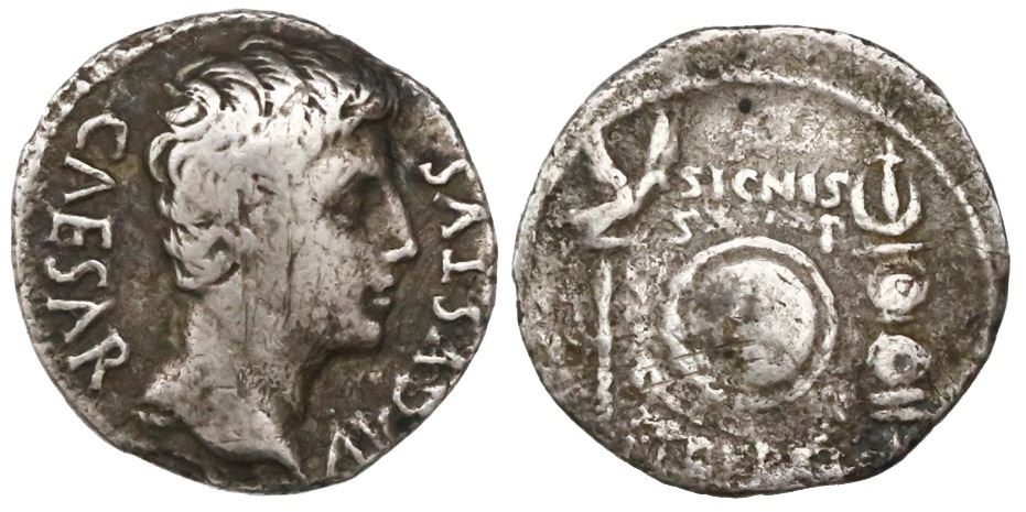 Roman Empire, AR denarius, 27 BC-14 AD, Augustus, uncertain Spanish mint (Colonia Patricia?), struck circa 19 BC. RIC-86a; RSC-265. 3.33 grams. Bare head right / Round shield inscribed, aquila and signum flanking. Toned Fine with minor marks on head, off-center reverse.