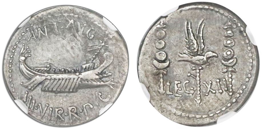 Roman Empire, AR denarius, Marc Anthony (died 30 BC), 32-31 BC, legion XII, military mint traveling with Marc Anthony, NGC Ch VF, strike 5/5, surface 3/5. Crawford-544/2; Sydenham-1230; RSC-41. 3.29 grams. Galley right, with filleted sceptre on prow / Eagle between two standards, below LEG XII. NGC #4283956-004.