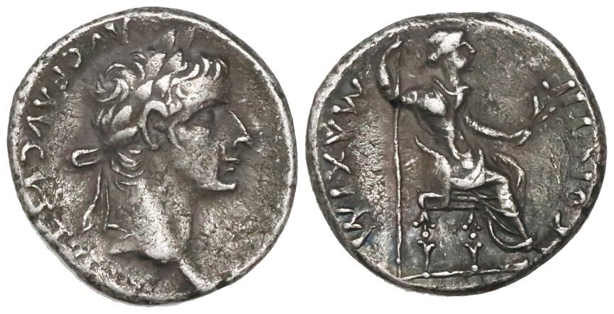 Roman Empire, AR denarius, "tribute penny," Tiberius, 14-37 AD, Lugdunum mint, struck 18-35 AD. RIC-30. 3.50 grams. Laureate head of Tiberius right / Livia as Pax seated right, holding scepter and olive branch, feet on footstool; ornate chair legs, single line below. Bold AXF, attractively toned, with very light surface porosity.