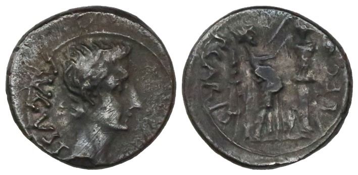 Roman Empire, AR quinarius, Augustus, 27 BC-14 AD, Emerita mint, P. Carisius, legate pro praetore, struck circa 25-23 BC. RIC I-1a; RSC-386. 1.55 grams. Bare head right / Victory standing right, crowning trophy; dagger and curved sword at base. Deeply toned AXF with very slight surface roughness, off-center strike.