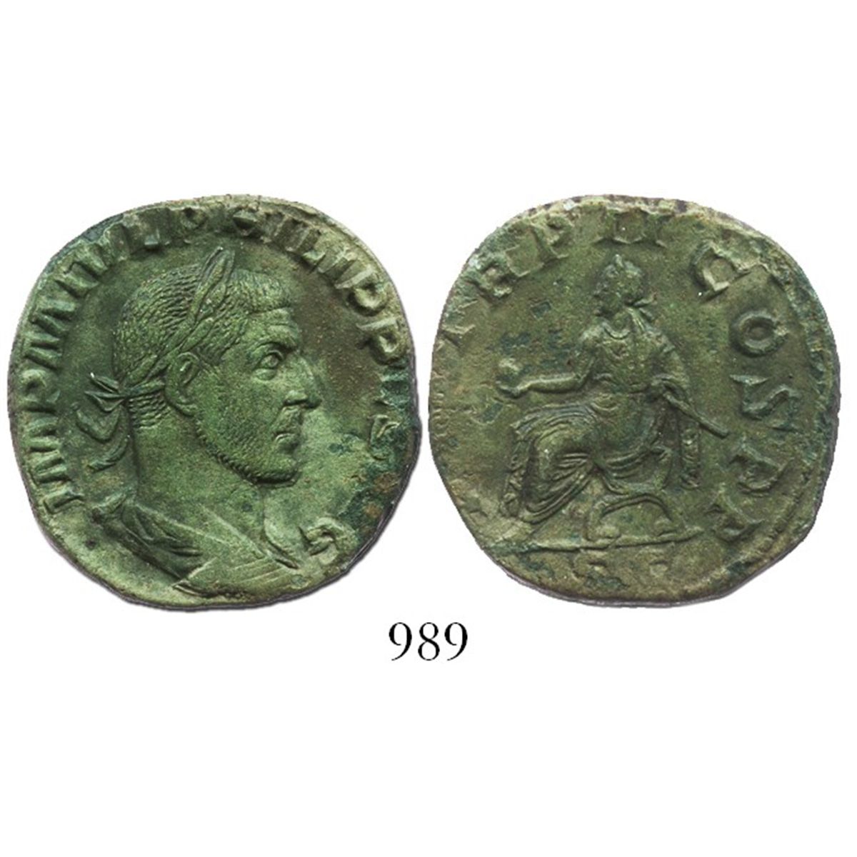 Roman Empire. Philip I (Arabs). 244-249 AD. AE sestertius. Rome mint. Struck 245 AD. Sear 9003; RIC 148a; Cohen 121. 17.0 grams. Laureate, draped, and cuirassed bust right / Philip seated left, holding globe and parazonium. Patinated XF/VF.