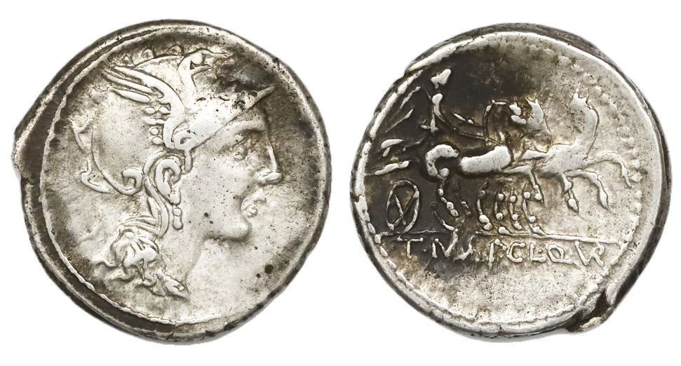 Roman Republic, AR denarius, Appius Claudius Pulcher, T. Manlius Mancius, and Q. Urbinius. 111-110 BC, Rome mint. Crawford 299/1b; Sydenham 570a; Mallia 2. 3.92 grams. Helmeted head of Roma right; quadrangular device to left / Victory driving triga right, T MAL AP CL Q VR in exergue. VF+ with area of dark toning on reverse.