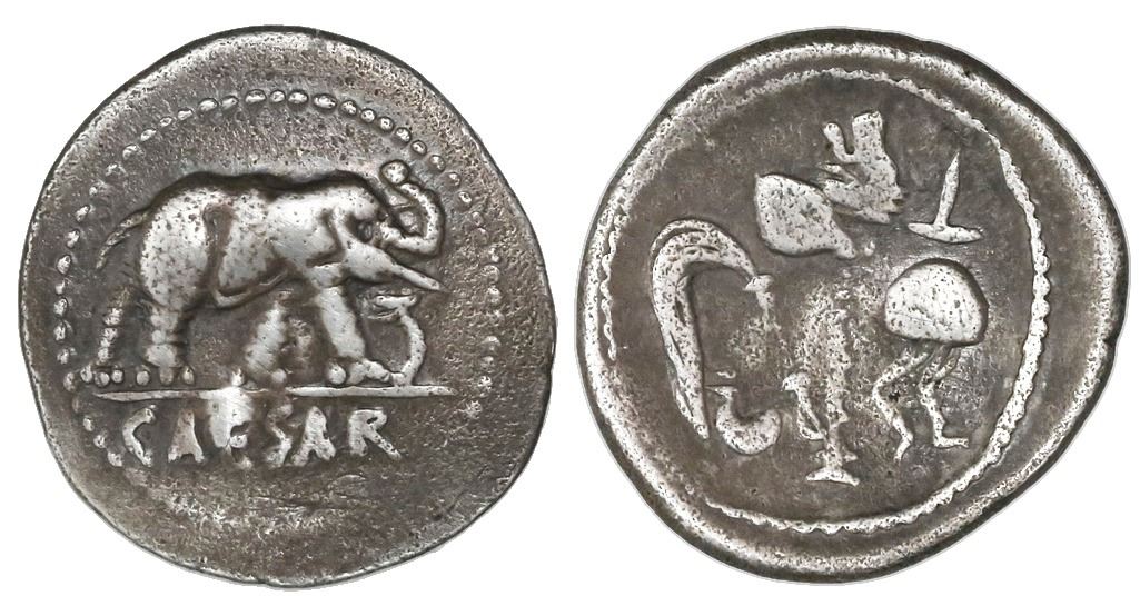 Roman Republic, AR denarius, Julius Caesar, military mint traveling with Caesar, ca. 49 BC. Crawford 443/1; Sydenham 1006, RSC 49. 3.19 grams. Elephant advancing right, trampling on horned serpent / Emblems of the pontificate: simpulum, aspergillum, securis, and apex. VG with important details clear and well toned.