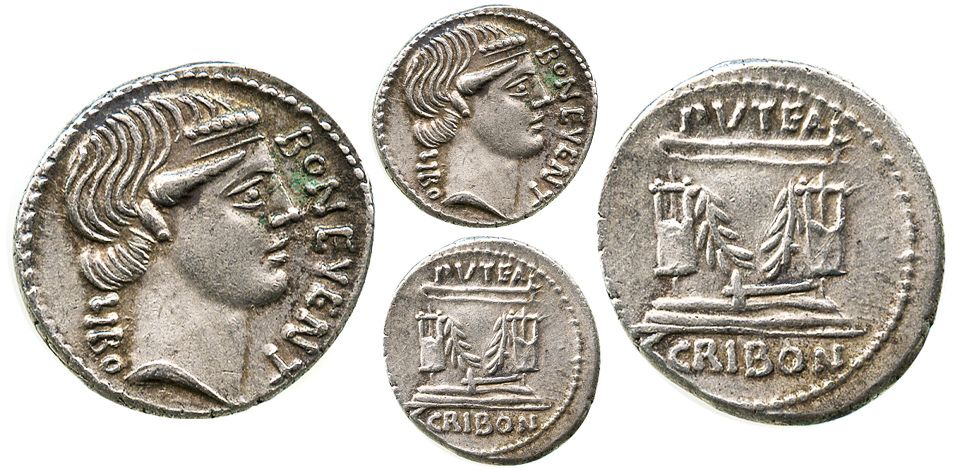 Roman Republic, AR denarius, L. Scribonius Libo, 62 BC, Rome mint. Craw. 416/1a. 4.0 grams. Diademed head of Bonus Eventus right/ Puteal Scribonianum (Scribonian Well), decorated with garland and two lyres; hammer at base. Bold XF+ with toning around details, some luster. Pedigreed to the Gorny & Mosch auction of March 2008, lot #1976.