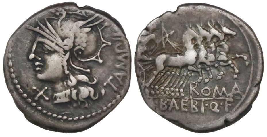 Roman Republic, AR denarius, M. Baebius Q.f. Tampilus, 137 BC, Rome mint. Crawford-236/1a; Sydenham-489; Baebia-12; RBW-975. 3.92 grams. Helmeted head of Roma left; X (mark of value) below chin / Apollo, holding bow and arrow, driving quadriga right. Attractively toned AVF with full details but both sides slightly off-center, slightly crude edge (as made).