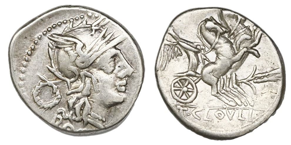 Roman Republic, AR denarius, T. Cloelius, 128 BC, Rome mint. Crawford 260/1; cf. Sydenham 516; cf. Cloulia 1. 3.93 grams. Helmeted head of Roma right; wreath to left / Victory driving rearing biga right, holding reins; stalk of grain below; T CLOVLI in exergue. XF with silver toning.