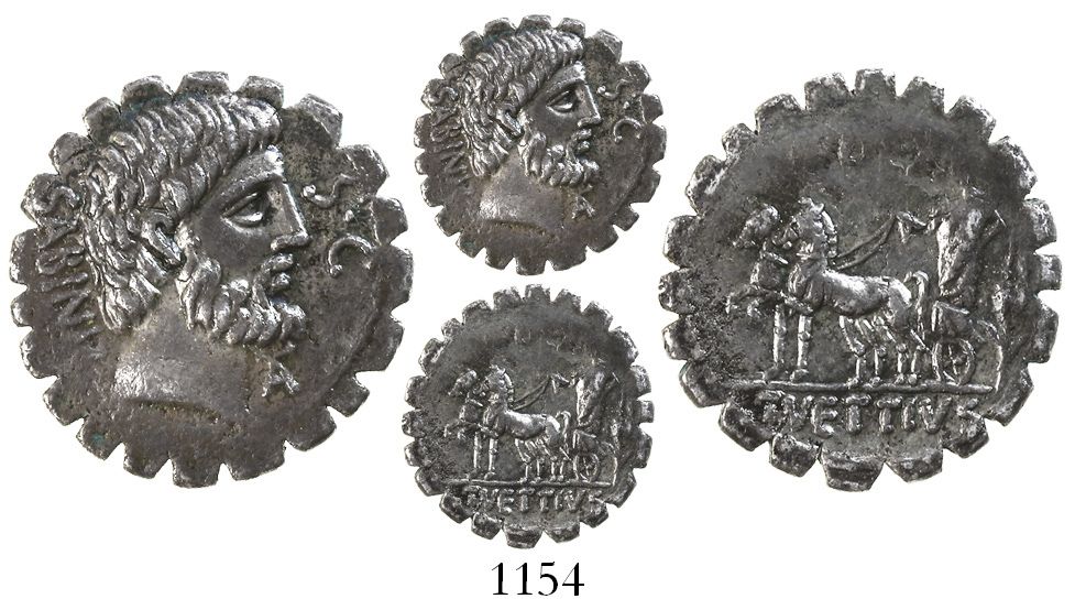Roman Republic, AR denarius, Vettius Sabinus, ca. 70 BC. Babelon Vettia 2. Sydenham 905. Crawford 404/1. 3.53 grams. Bearded head of King Tatius right; below chin, TA ligate and behind, SABINVS; in right field, S.C / IVDEX togate figure in slow biga left; behind, corn-ear; in exergue, T.VETTIVS. Richly toned XF with bold details on both sides, serrated edge.