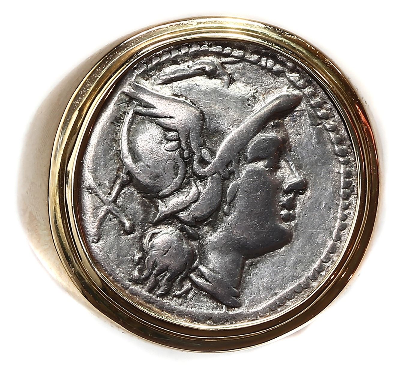 Roman Republic, AR denarius, ca. 150-115 BC, mounted head-side out in 14K gold men's ring (size 9-1/