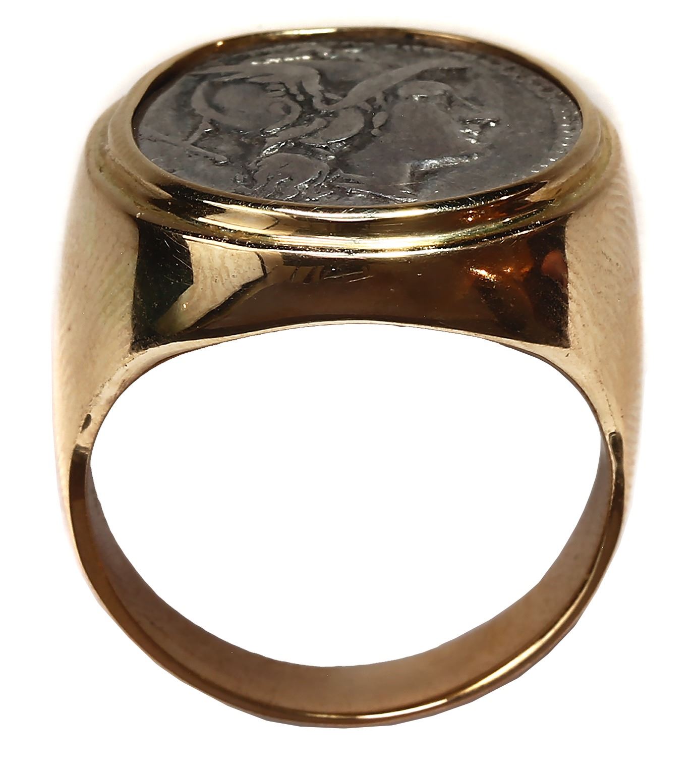 Roman Republic, AR denarius, ca. 150-115 BC, mounted head-side out in 14K gold men's ring (size 9-1/2) with perforated back. 13.51 grams total. Helmeted head of Roma right; X behind / Dioscuri galloping right. Heavy smooth-sided gold ring, the coin from the Roman Republic time period but impossible to fully attribute since the other side is not visible.