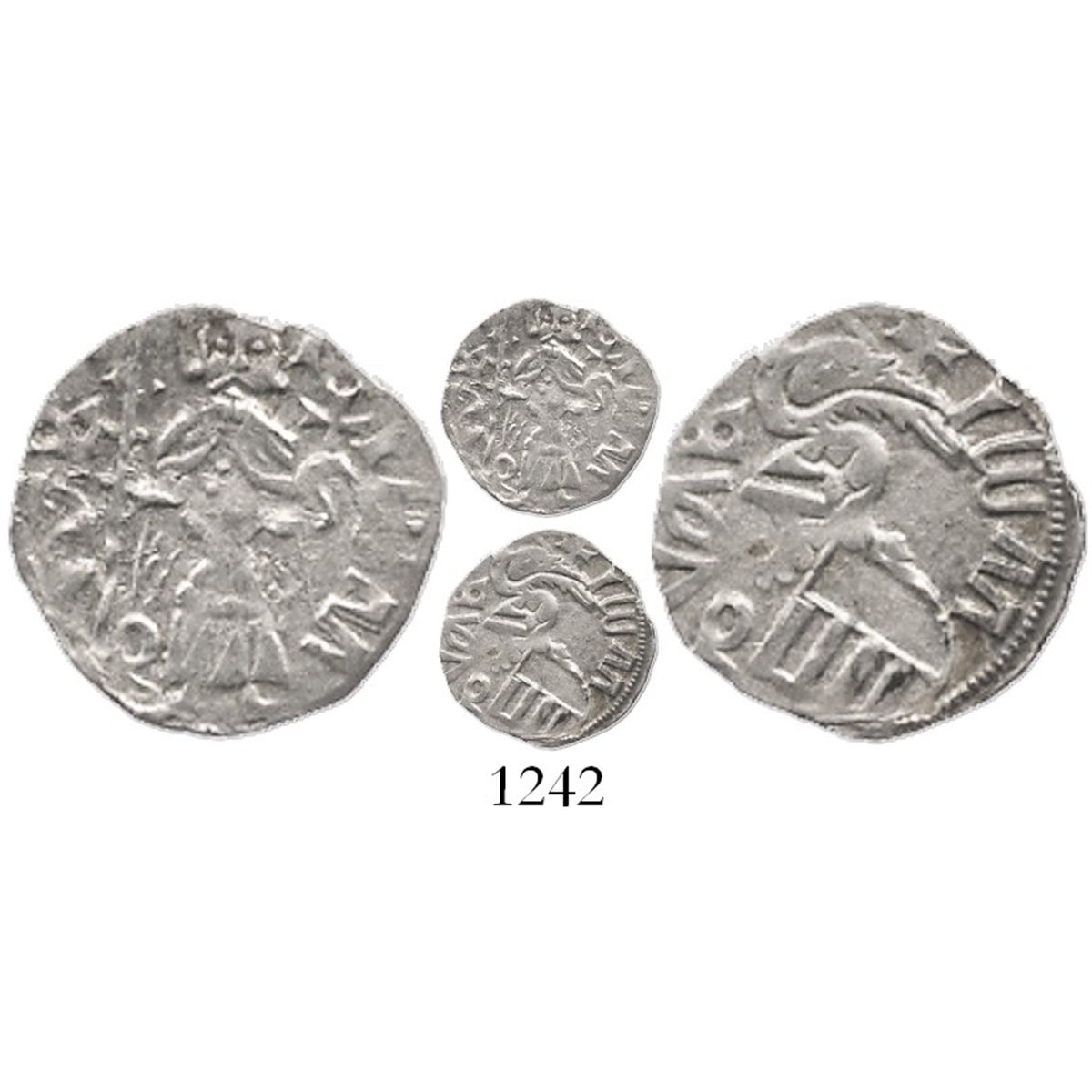 Romania (Wallachia), silver ducat, Mircea the Elder (1386-1418) (Dracula's grandfather). 0.5 gram. Small, thin coin with standing king with lance on obverse, eagle/helmet/tilted shield on reverse, XF grade but choice strike, very popular issue as circulated in the place and time of Vlad III Dracula, AKA "Vlad the Impaler."