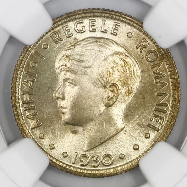 Romania (struck at the Heaton mint), 5 lei, Mihai I, 1930-H, NGC MS 66, finest known in NGC census. KM-48. Rare in high Mint State with just one other in MS 66 and the next closest being a handful of MS 64s. Smooth, lustrous and mark free surfaces with light red hues of toning on bust. NGC #4740391-012.