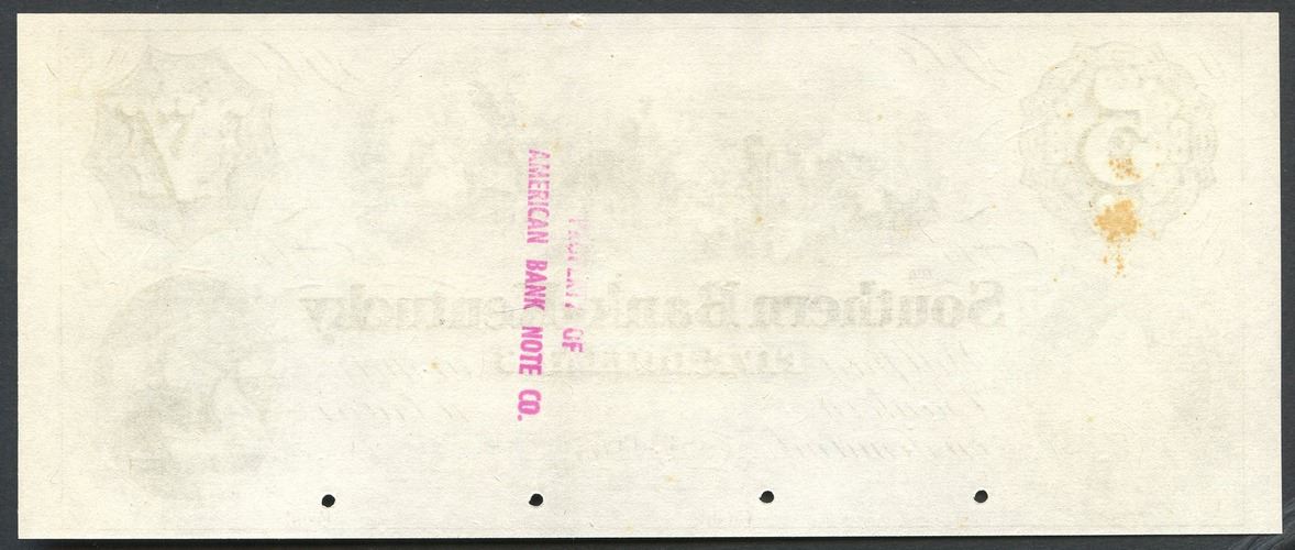Russellville, Kentucky, Southern Bank of Kentucky, 5 dollars front proof, ND (18XX), no overprint. H-KY285-G336a. ABNCo proof with sharp edges and corners, stain on center left.