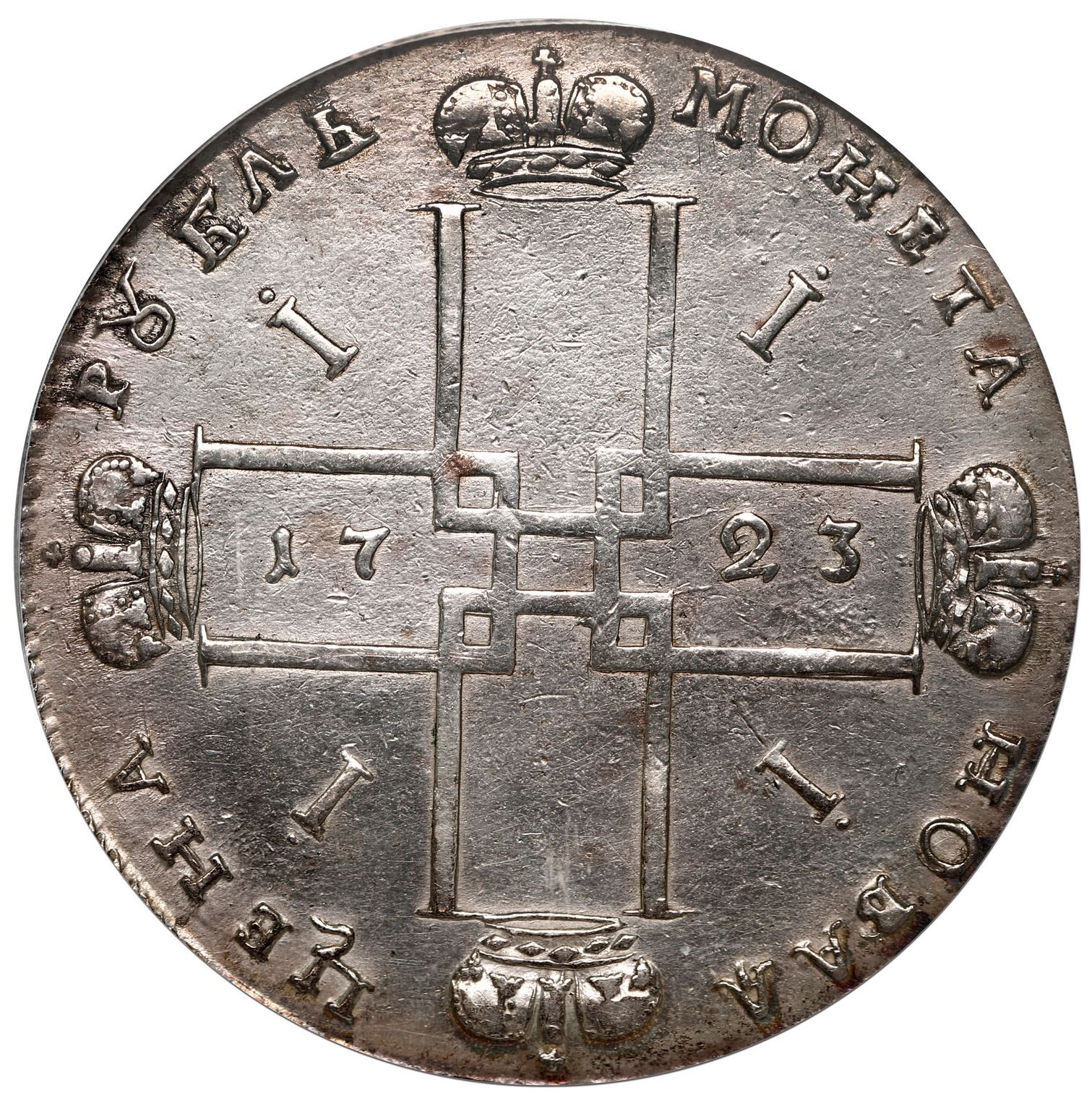 Russia (Moscow mint), 1 rouble, Peter I ("the Great"), 1723 OK, small cross on chest, continuous obverse legend with rosettes, PCGS XF detail / repaired. Bitkin-884; KM-162.3; Dav-1658. Unevenly toned obverse with old digs behind head, minor repair at one o'clock on obverse rim, the reverse somewhat lustrous, a scarce and desirable type that comes in several varieties. Pedigreed to a banker's collection from the early 1900s.