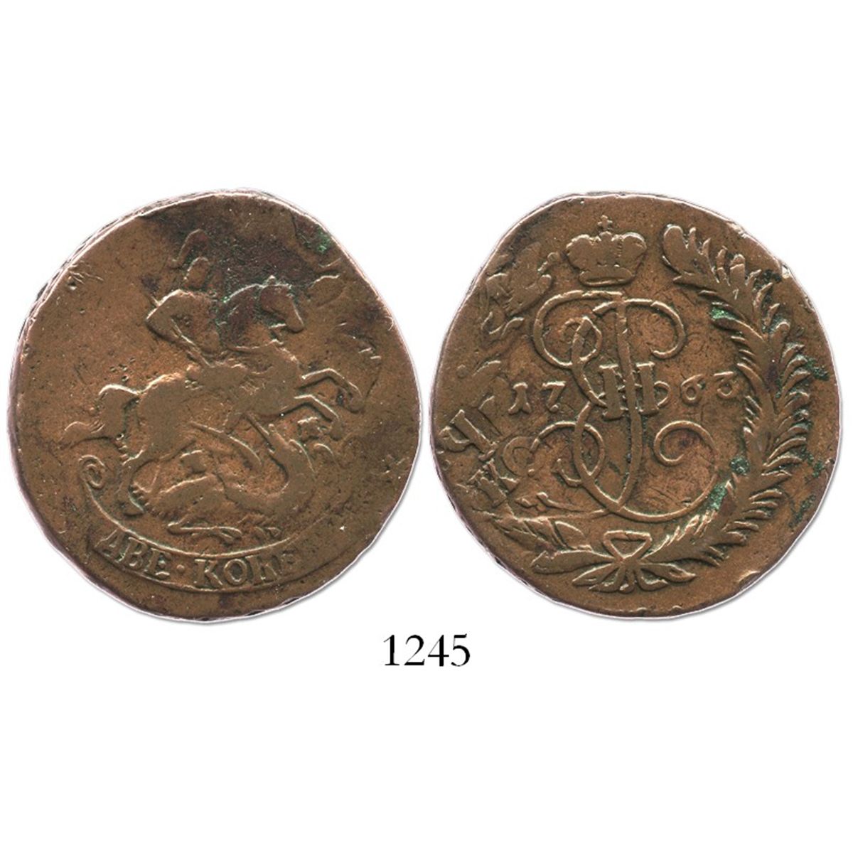 Russia, copper 2 kopeks, Catherine II, 1763 (no mintmark), struck over an earlier 4 kopeks.