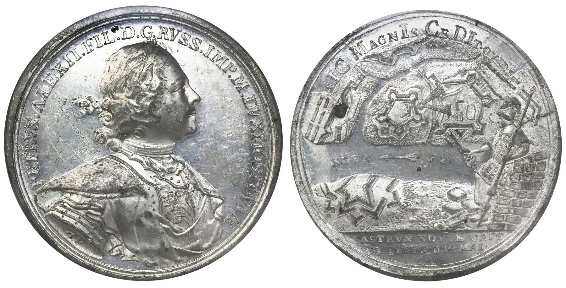 Russia, white-metal medal, dated 1703, Peter I (the Great) capture of Nienshanc, NGC MS 62, finest and only known example in NGC census. Diakov-17.6. 48 mm. High relief bust of Peter I on obverse with his name and titles above; reverse features an armored soldier holding a lance and a key over a map of the Nienshanc fortress, legends above and in exergue. Bright white medal with minor contact marks. In a large NGC slab. NGC #5709499-002.