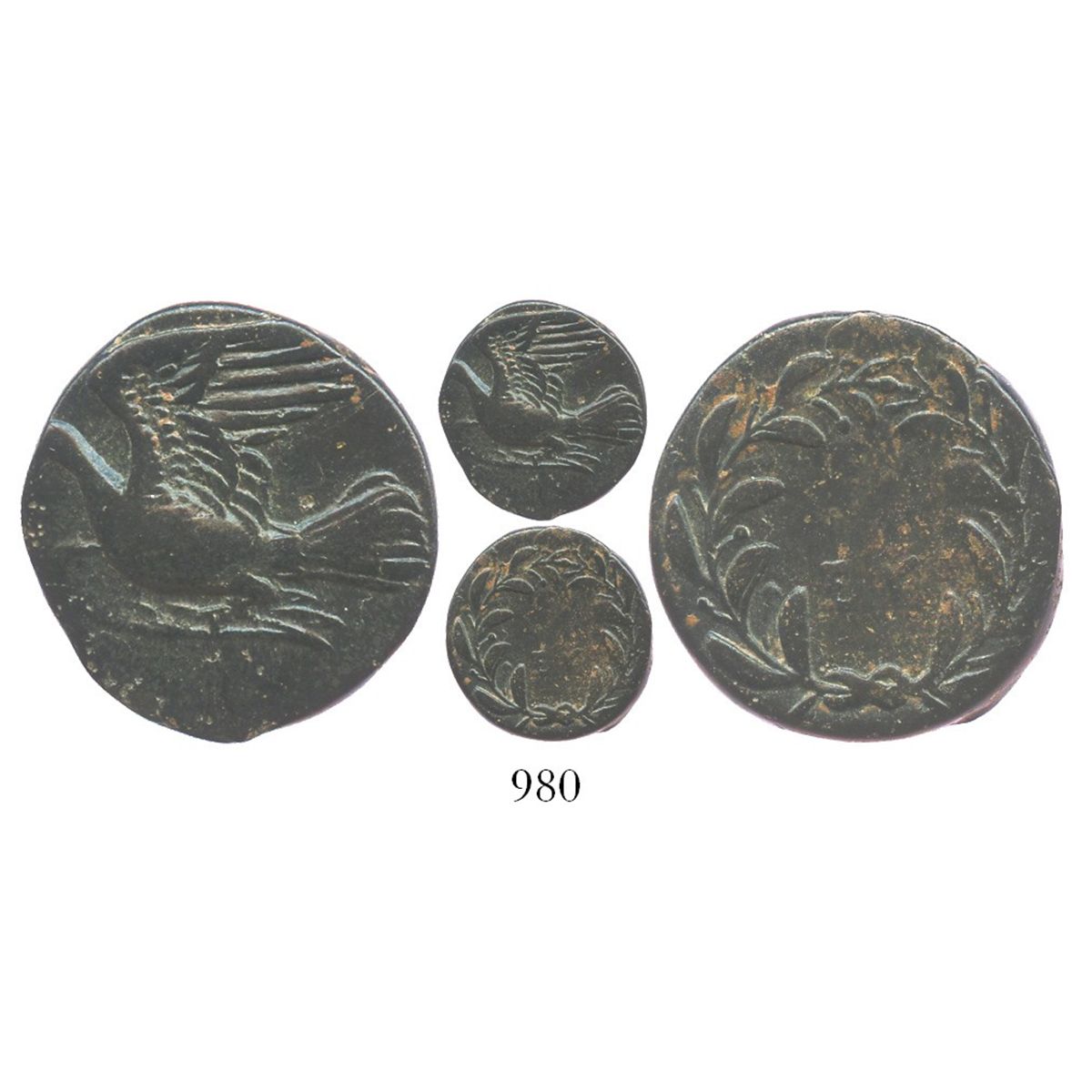 SIKYONIA, Sikyon. Ca. 330-310/05 BC. AE dichalkon. Ex-BCD collection. Warren Group 5, 1st ser., 5.4a(3), Warren 1998, 65 (this coin). BCD Peloponnesus 305.6. 3.7 grams. Dove flying left / EY within wreath below. Bold, dark AVF. Pedigreed to the BCD collection and plated in Warren.