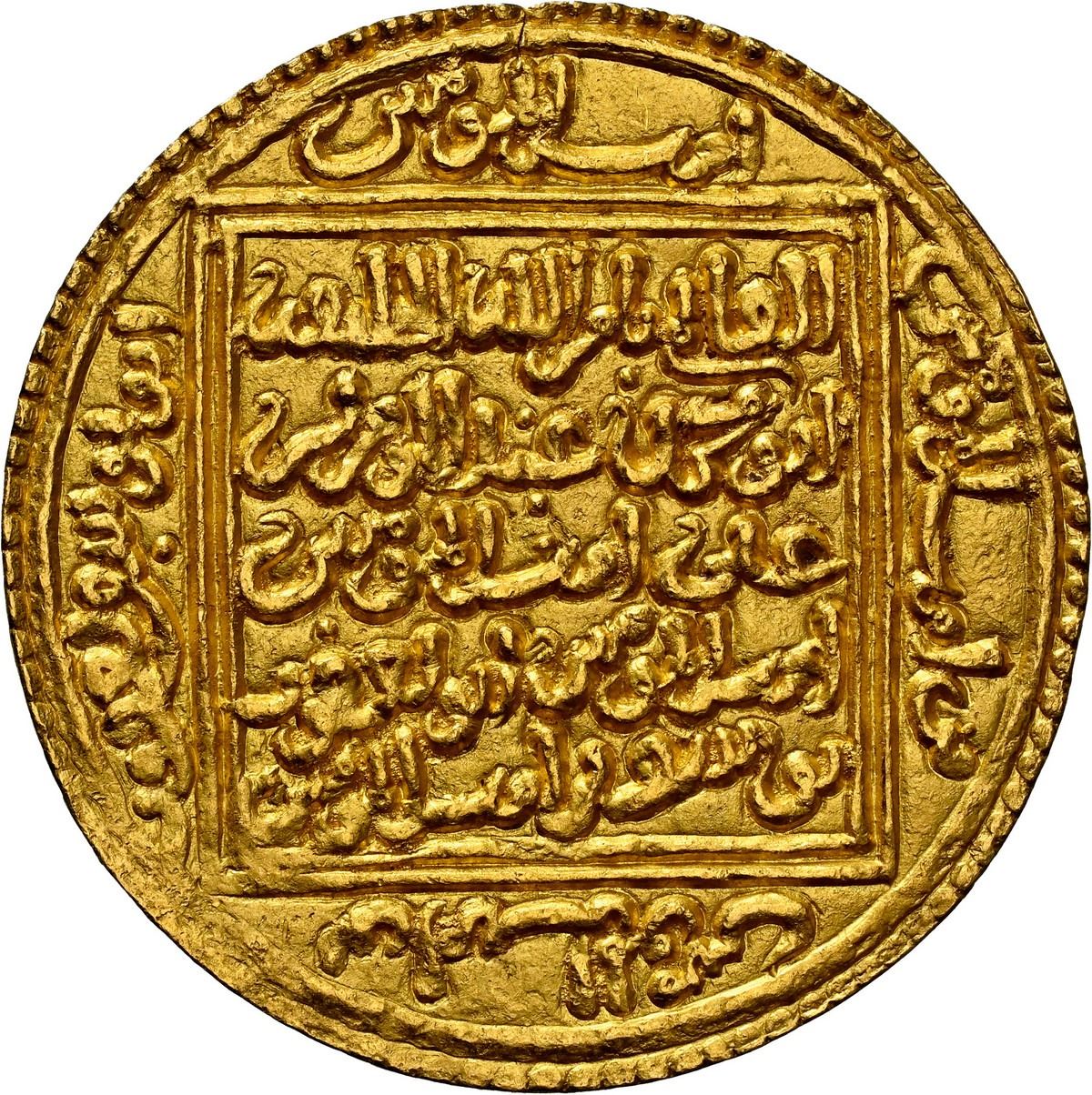SPAIN (Al-Andalus), Almohads, AV dinar, Abu Yusuf Ya‘qub ibn Yusuf ibn ‘Abd al Mu’min al Mansur أبو يوسف يعقوب بن يوسف بن عبد المؤمن المنصور, 580-595 AH (1184-1199 AD), rare, NGC MS 65. Vives-2066; Hazard-501. 4.60 grams. Square in circle type with central epigraphic inscriptions naming the ruler and his Almohad lineage, typical Almohad design without mint or date. Struck during the reign of Abu Yusuf Ya‘qub who adopted the title al Mansur Billah (“Victorious through God”) after defeating the army of the Castilian king Alfonso VIII at the Battle of Alarcos on July 18, 1195. Choice grade with bold full inscriptions and nice luster.