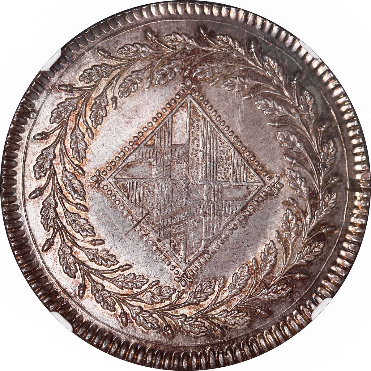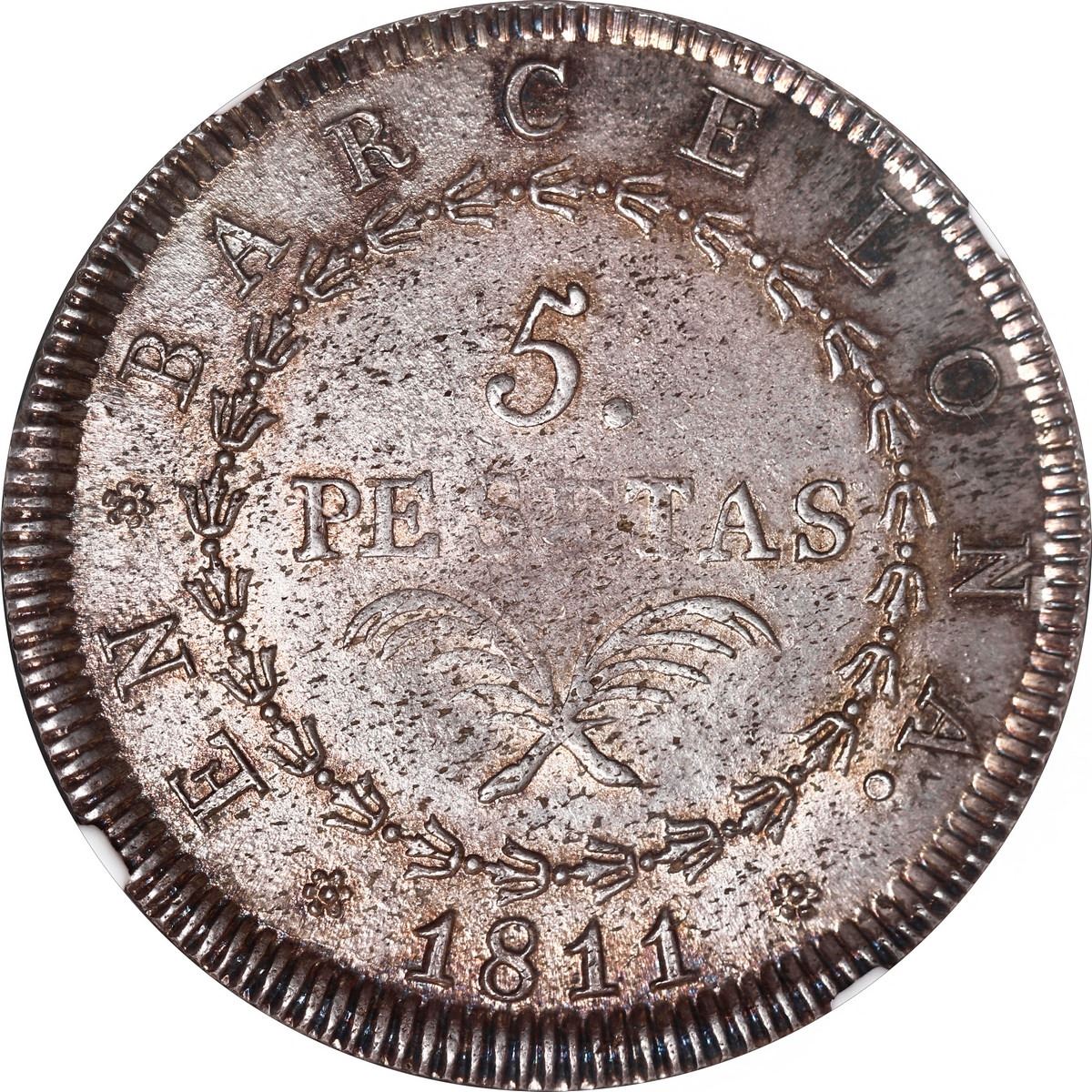 SPAIN, Barcelona, 5 pesetas, Joseph Napoleon, 1811, 25 flowers in wreath, NGC MS 64. Cal-47; KM-69. Lightly rainbow toned over luster, the rims bold but centers slightly weak (also with adjustment marks in shield), very choice grade (second finest in NGC census behind a single MS 66).