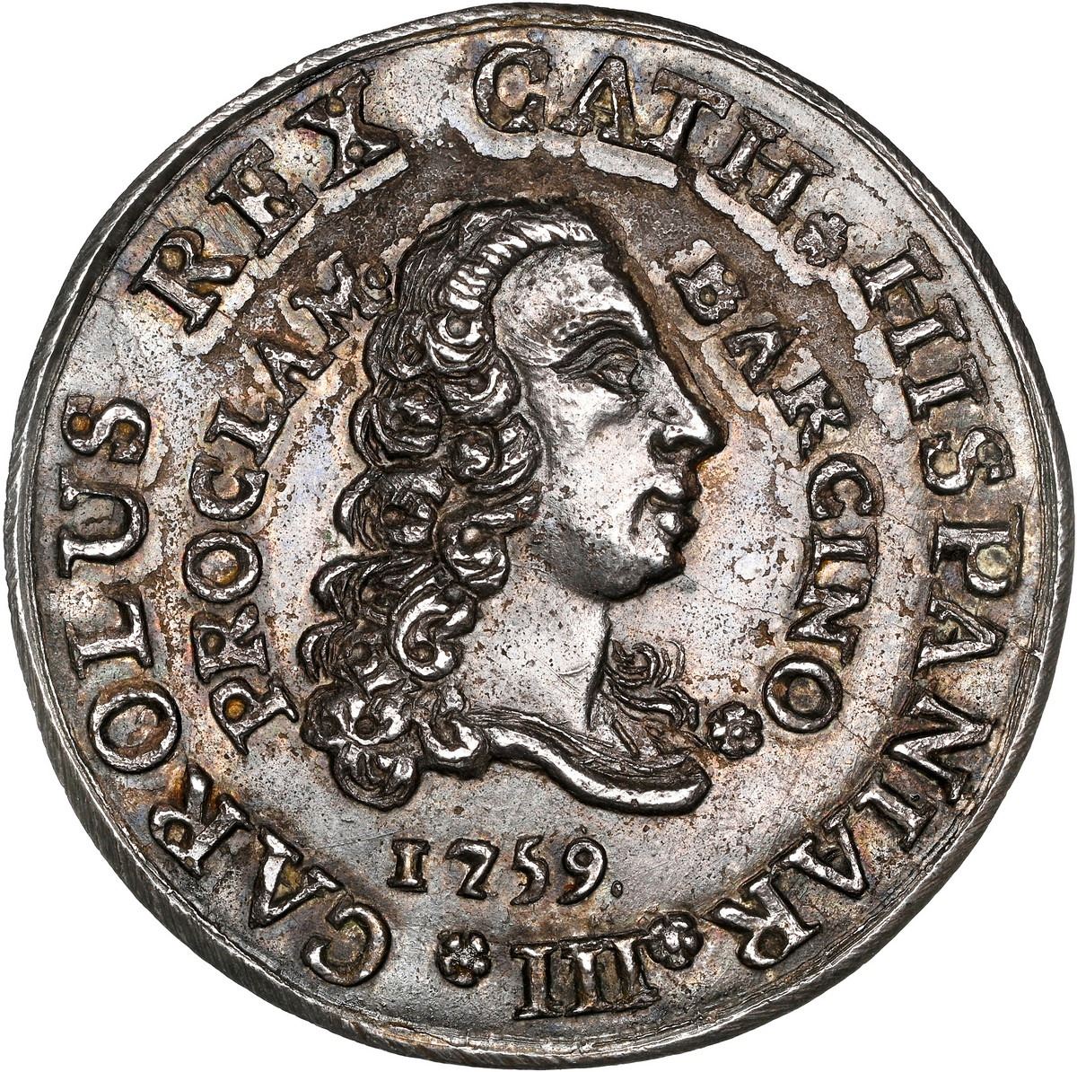 SPAIN, Barcelona, silver medal, 1759, Charles III proclamation, NGC MS 62.