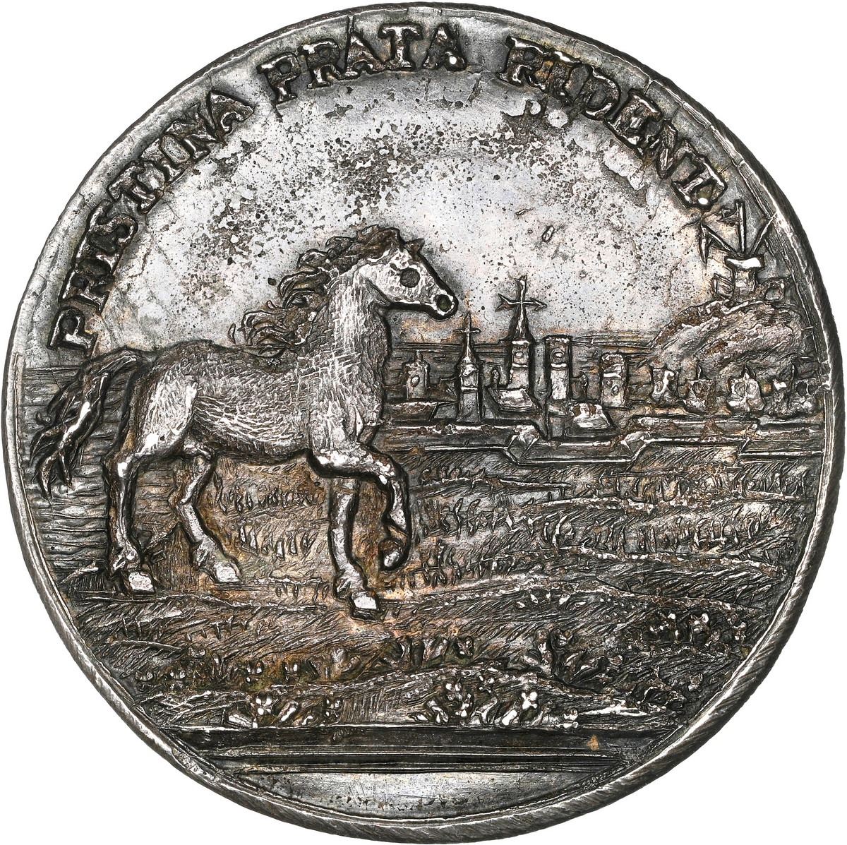 SPAIN, Barcelona, silver medal, 1759, Charles III proclamation, NGC MS 62. Herrera-6; Vives-25. 29 mm. Obverse with right-facing bust of king inside PROCLAM BARCINO within legend CAROLUS REX CATH HISPANIAR III; reverse with right-facing horse to left of Barcelona in background within legend PRISTINA PRATA RIDENT (the pristine meadows laugh); plain edge. Somewhat rustic, with bold details, very darkly toned with traces of porosity in fields. Barcino is the ancient Roman name for the city of Barcelona.