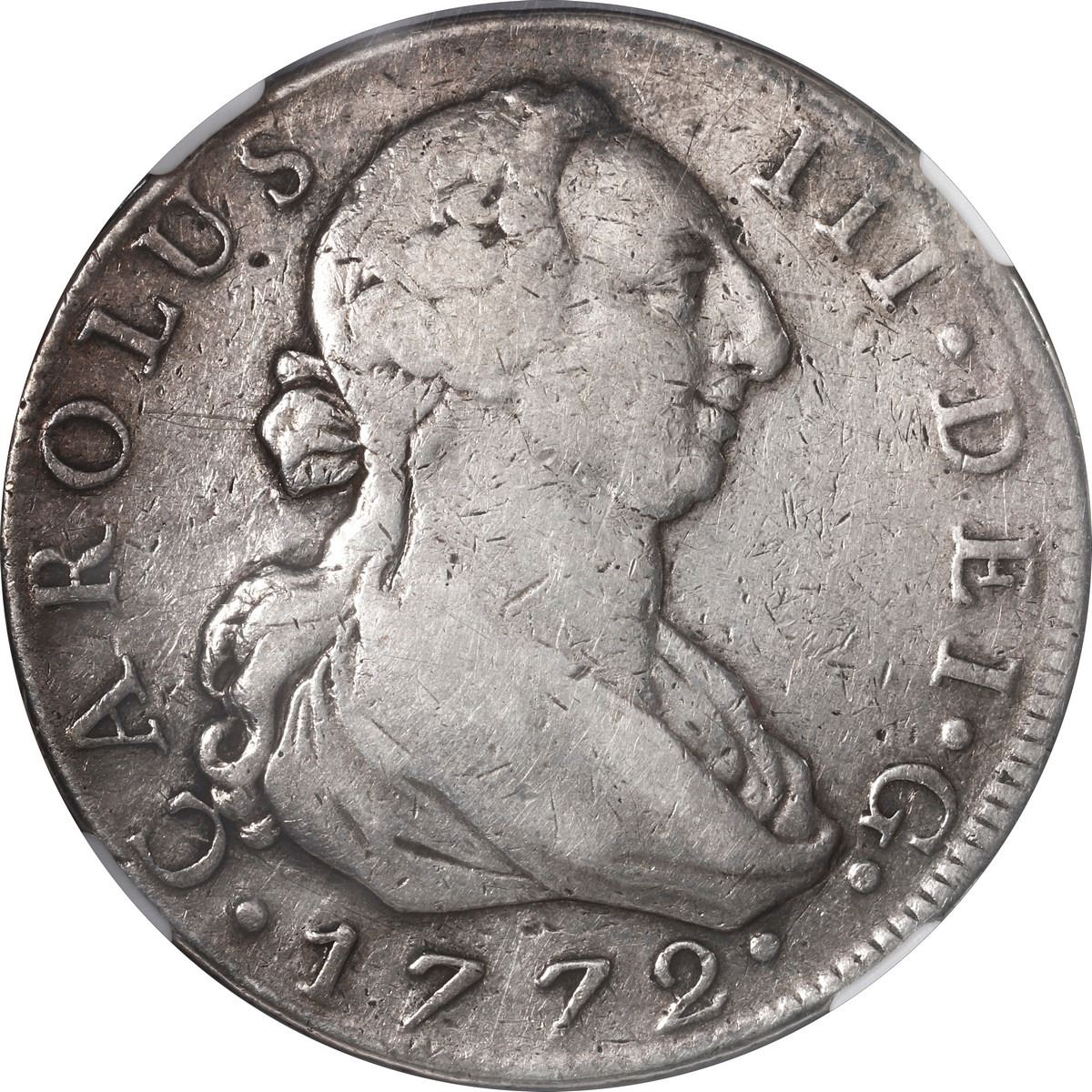 SPAIN, Madrid, bust 8 reales, Charles III, 1772 PJ, NGC VF details / damaged. Cal-1062; KM-414.1. First year of issue for this bust type. Bold piece with bright surfaces showing some chatter.