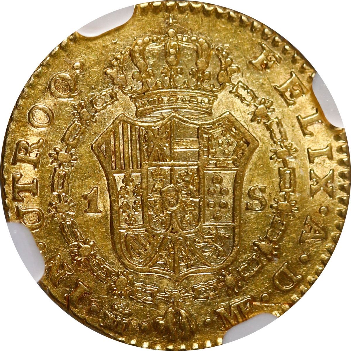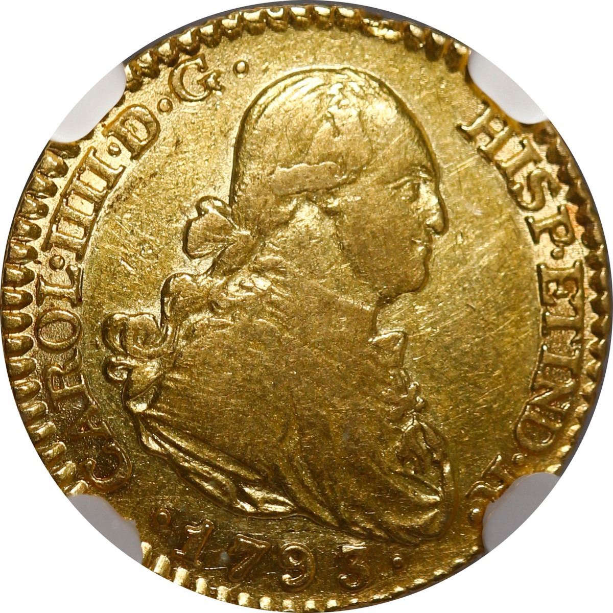 SPAIN, Madrid, gold bust 1 escudo, Charles IV, 1793 MF, NGC AU 55. Cal-1110; KM-434; Fr-298. Decent luster, light yellow color, nearly full rims.