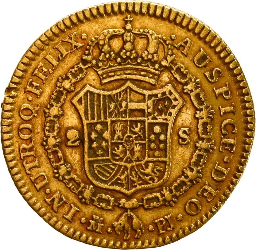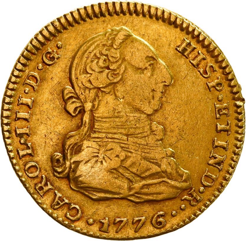 SPAIN, Madrid, gold bust 2 escudos, Charles III, 1776/4 PJ. Cal-1550; KM-unl (417.1 for type); Fr-286. 6.71 grams. VF with some surface marks, light sedimentation on the reverse, popular date with U.S. collectors.