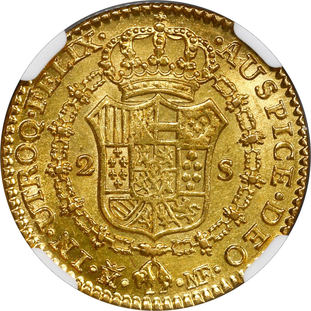 SPAIN, Madrid, gold bust 2 escudos, Charles IV, 1800/799 M, NGC AU 58. Cal-1296; KM-435.1; Fr-296. Nice luster, light yellow color, full rims and sharp details, last digit of date looks more like 0/6 (so possibly a new variety).
