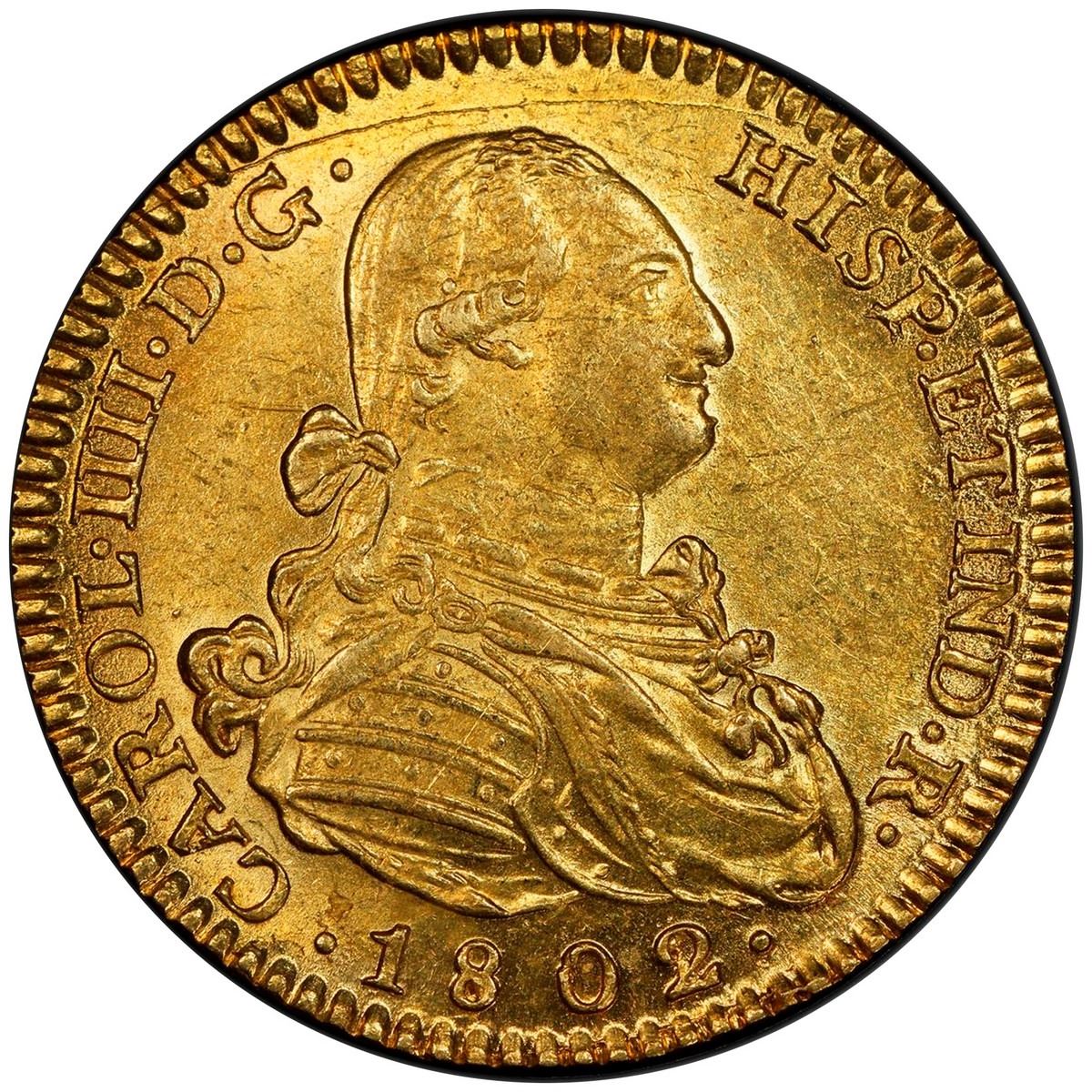 SPAIN, Madrid, gold bust 2 escudos, Charles IV, 1802/1 FA, PCGS MS62, finest known in PCGS census. Cal-1304; KM-435.1; Fr-296. Brightly lustrous, light yellow color, choice strike with full rims but arc-shaped die-crack above head, the finest at PCGS with just one finer at NGC in MS 64.
