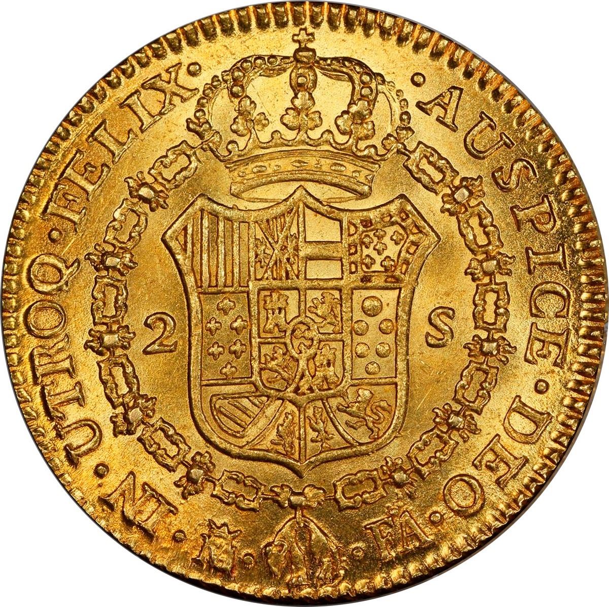 SPAIN, Madrid, gold bust 2 escudos, Charles IV, 1802/1 FA, PCGS MS62, finest known in PCGS census.