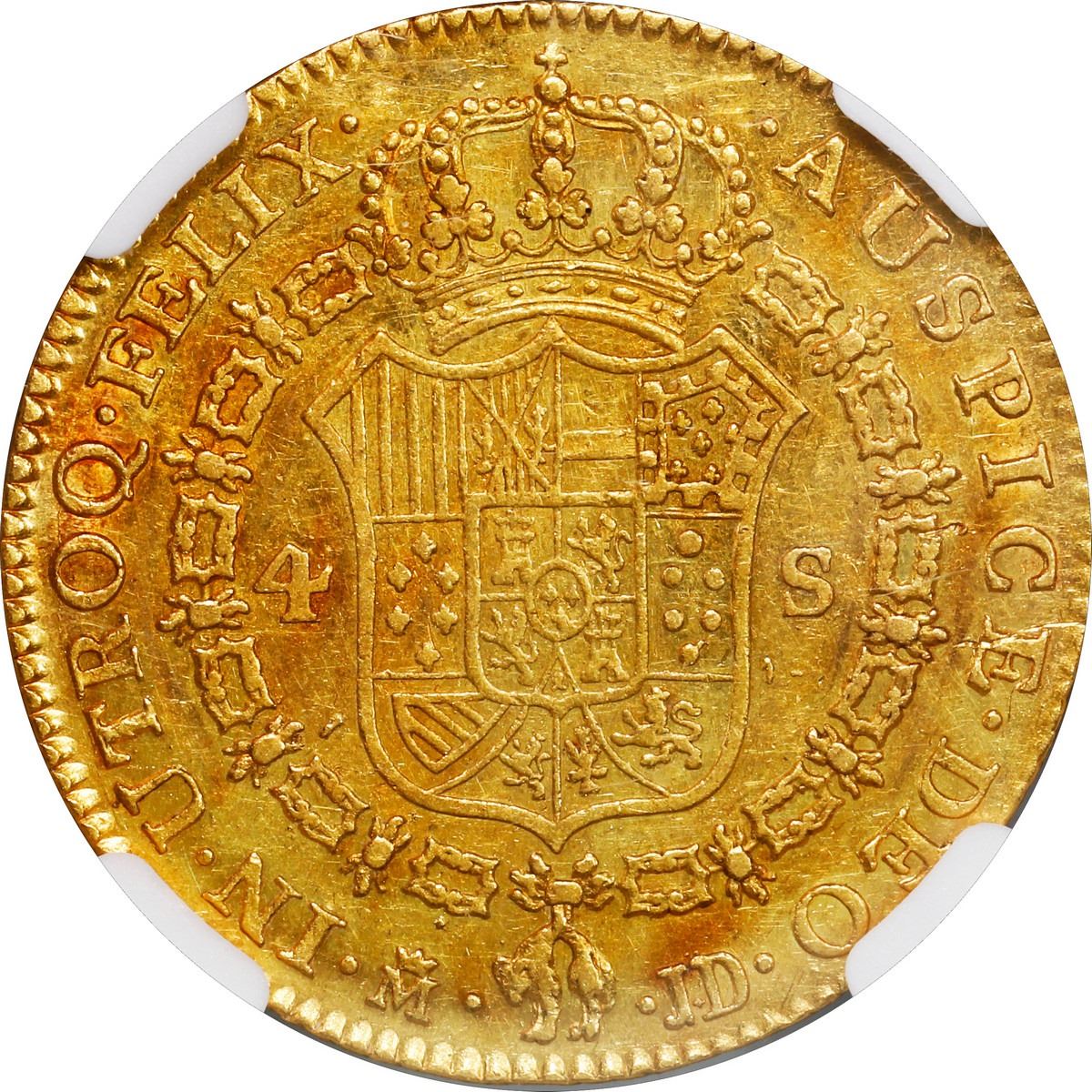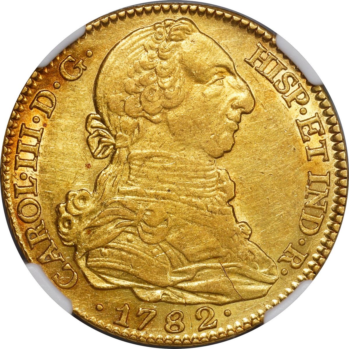 SPAIN, Madrid, gold bust 4 escudos, Charles III, 1782 JD, NGC AU details / cleaned. Cal-1787; KM-418.1; Fr-284. Good strike and luster with minimal wear and marks but light hairlines in fields, traces of reddish toning.