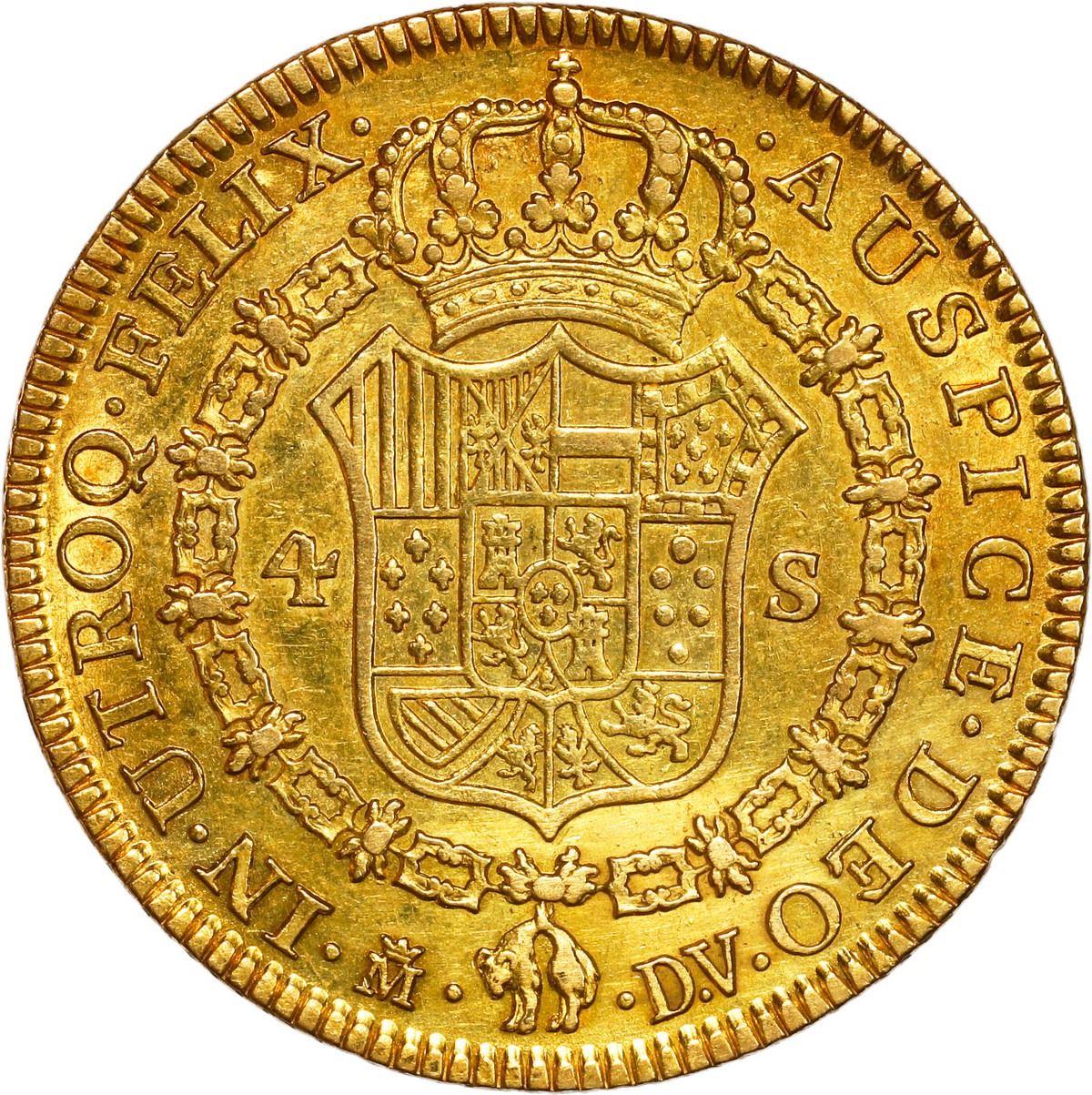 SPAIN, Madrid, gold bust 4 escudos, Charles III, 1786 DV. Cal-1791; KM-418.1a; Fr-284. 13.48 grams. Great strike with full rims, muted luster, rich gold color, AU with light surface hairlines on obverse.