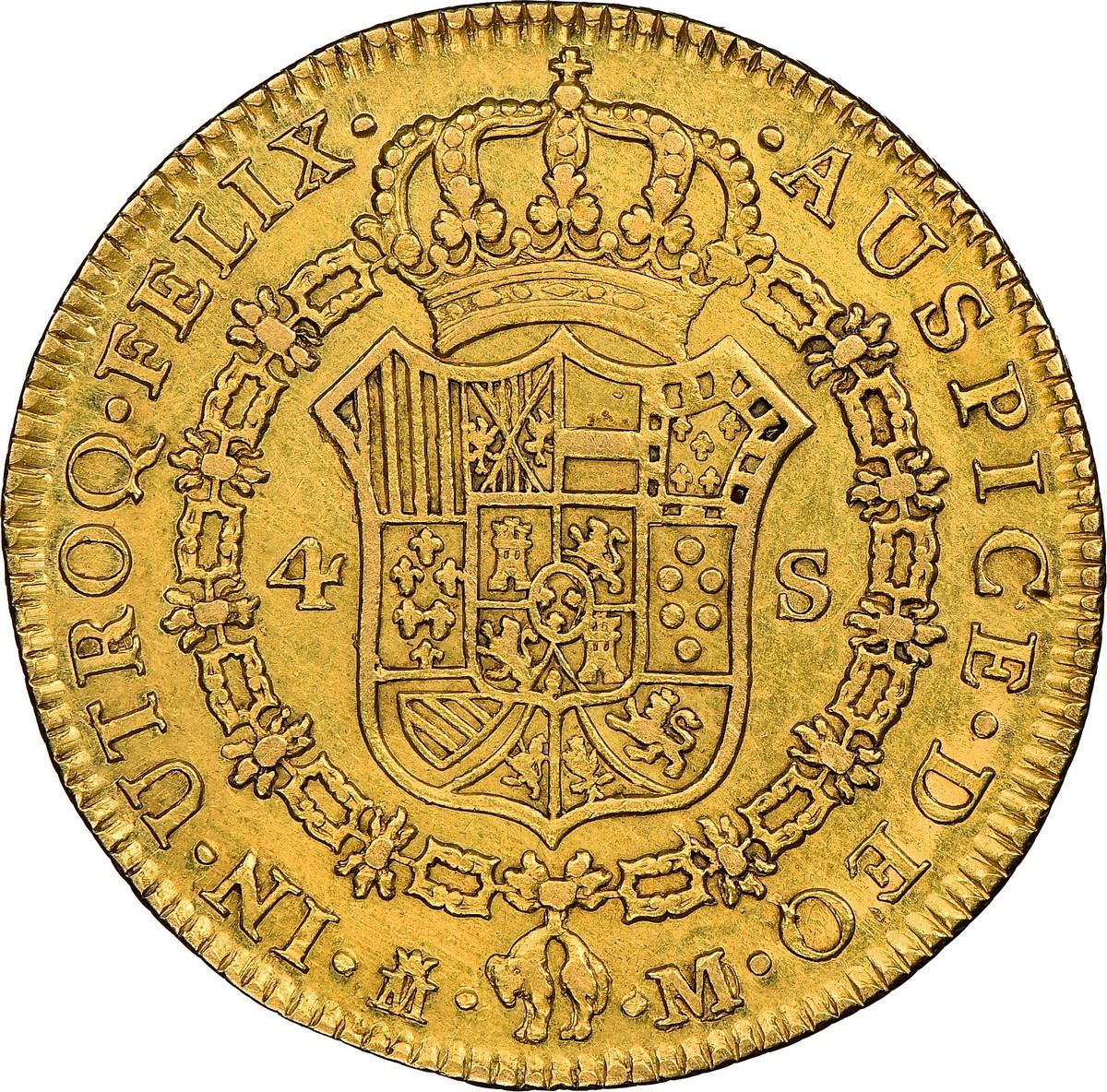 SPAIN, Madrid, gold bust 4 escudos, Charles III, 1788/3 M/JD, very rare, NGC XF 45, finest and only example in NGC census, ex-Iriarte. Cal-unl (Type 169); KM-unl (418.1a for type); Fr-284. 13.47 grams. Good luster and rather smooth fields for the grade, well struck as usual (in light yellow gold), clear overdate (not noted on label) and over-assayer (known but not yet listed in references), technically finest in NGC census as no others with M/JD are listed yet. Pedigreed to the Iriarte Collection (Aureo auction of March 1998, lot 912).