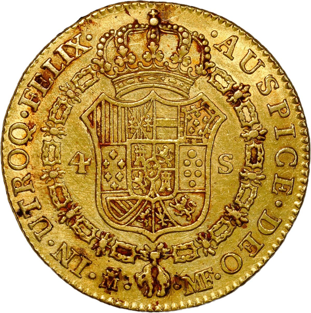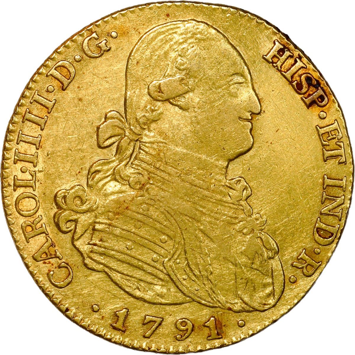 SPAIN, Madrid, gold bust 4 escudos, Charles IV, 1791 MF. Cal-1474; KM-436.1; Fr-294. 13.53 grams. XF with surfaces hairlines, a few specks of sedimentation.
