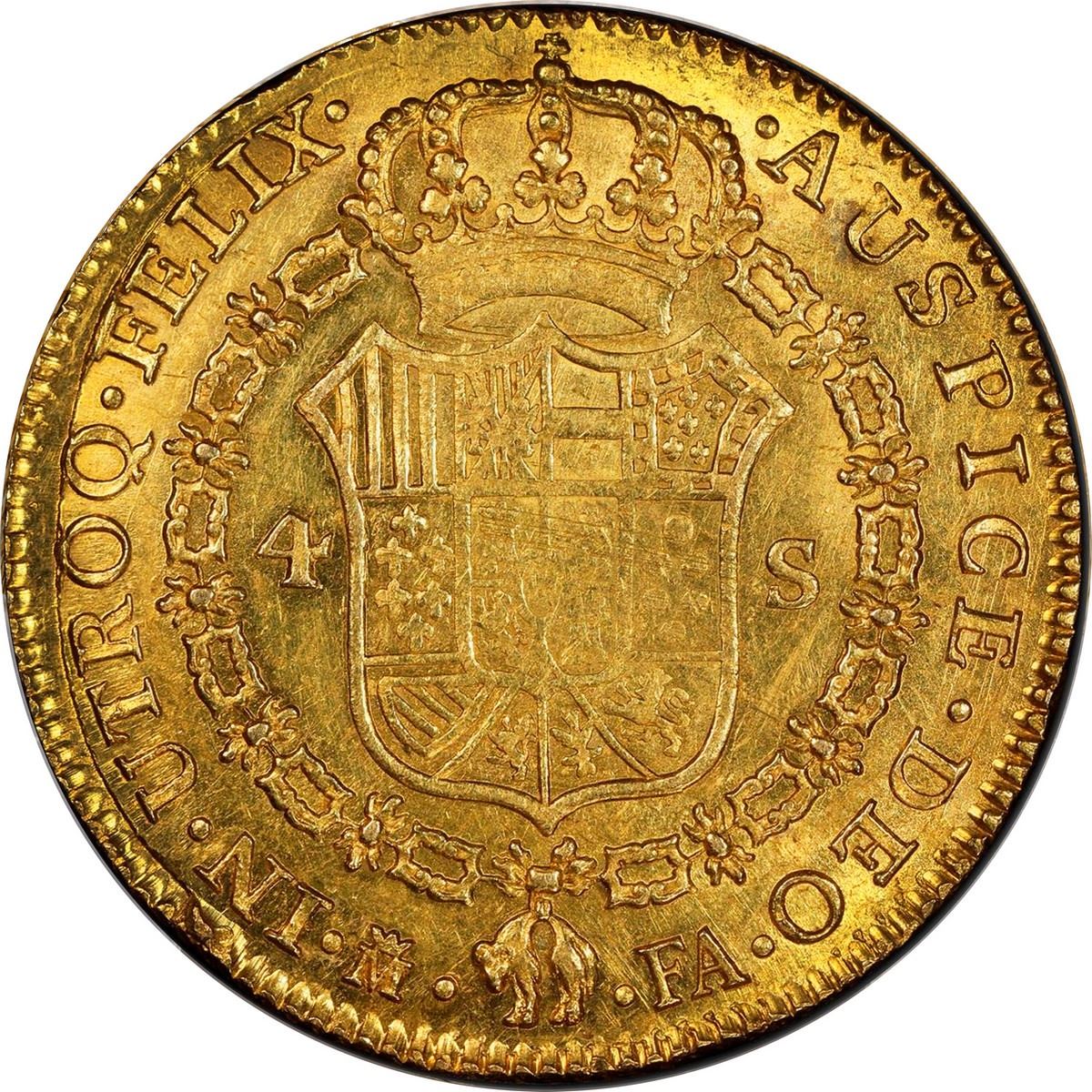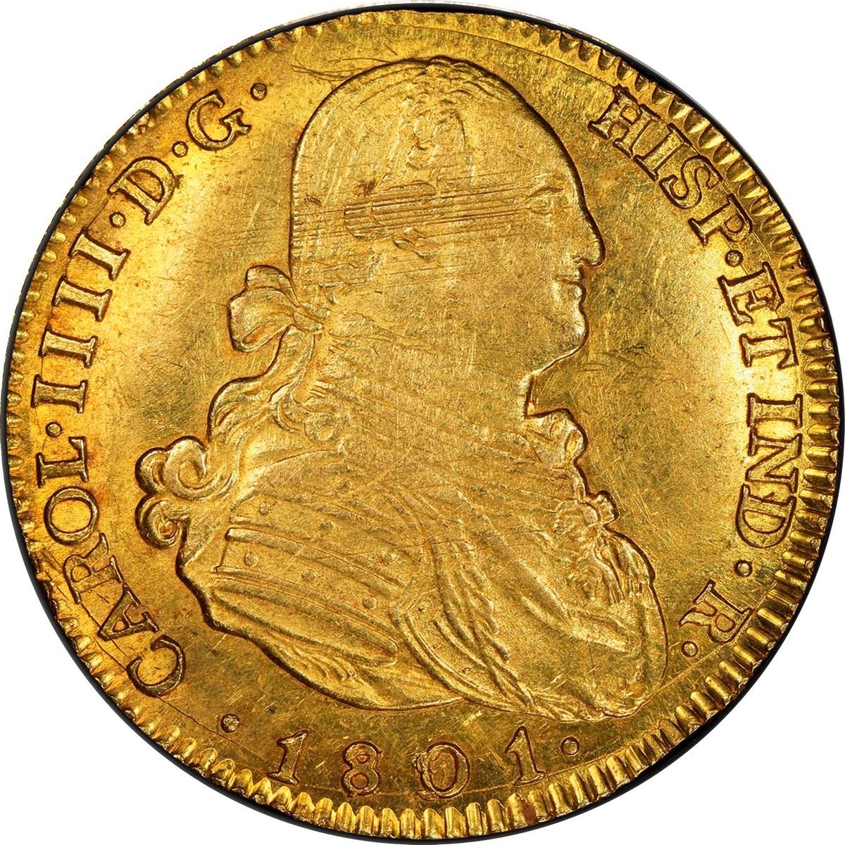 SPAIN, Madrid, gold bust 4 escudos, Charles IV, 1801/791 FA, PCGS MS62. Cal-1480; KM-436.1; Fr-294. Choice luster, full rims and sharp details but with adjustment marks in centers on both sides, second finest in PCGS census behind a single MS63+.