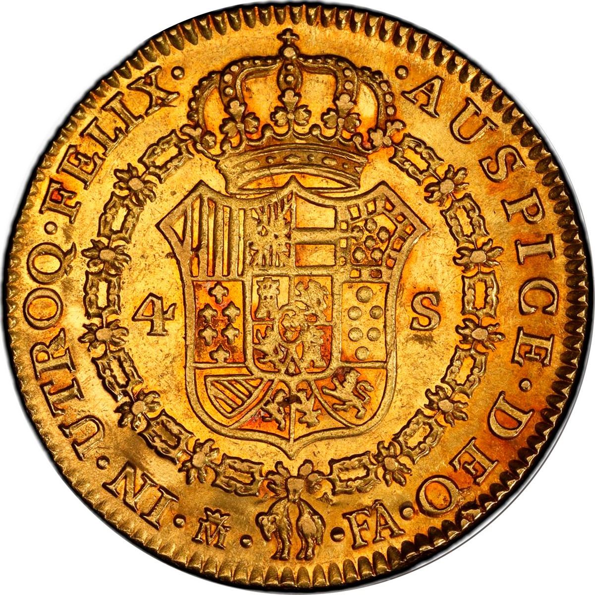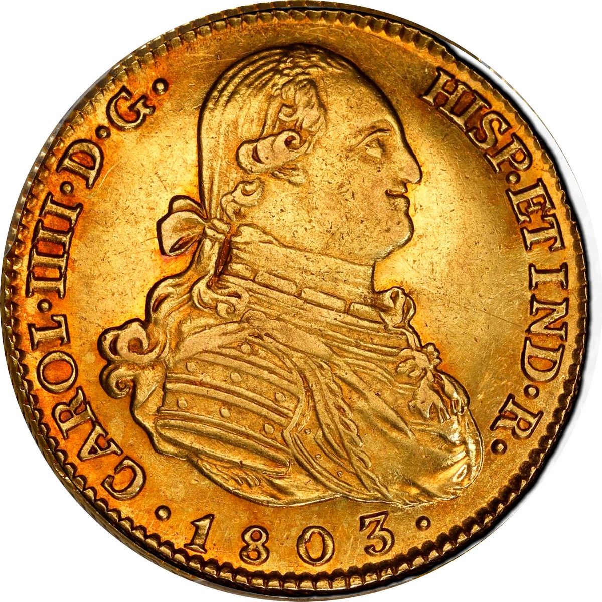 SPAIN, Madrid, gold bust 4 escudos, Charles IV, 1803 FA, PCGS AU58. Cal-1482; KM-436.1; Fr-294. Rich red toning over nice luster, sharp details, faint die-buckling on obverse.