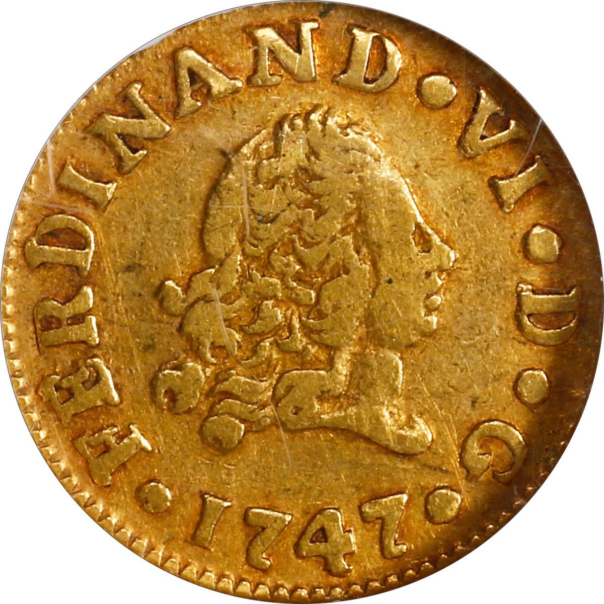 SPAIN, Madrid, gold bust ½ escudo, Ferdinand VI, 1747 JB, NGC VF 30. Cal-548; KM-372; Fr-274. Modestly circulated piece with rich golden-toned fields.