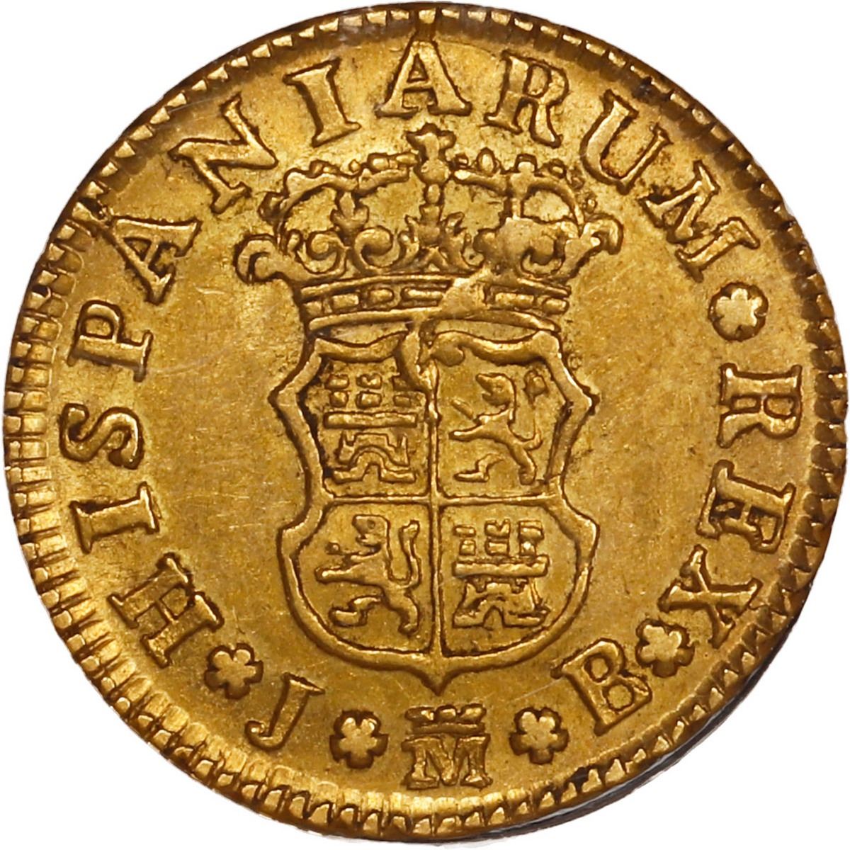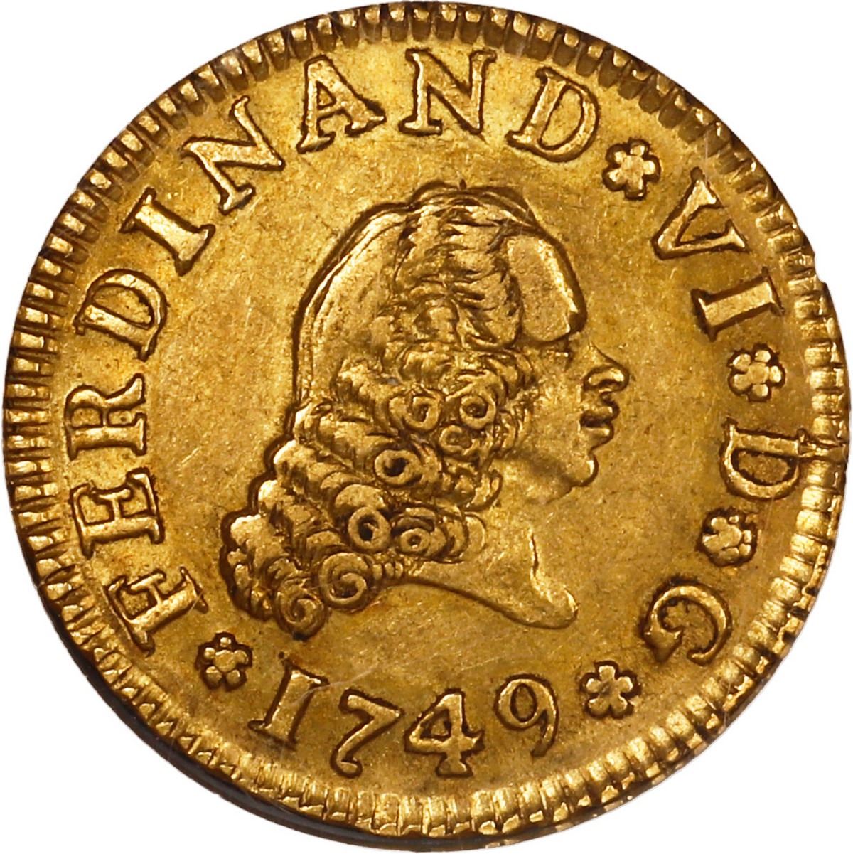 SPAIN, Madrid, gold bust ½ escudo, Ferdinand VI, 1749 JB, NGC AU 53, ex-Eliasberg. Cal-551; KM-378; Fr-274. Rich gold color, with full details including rims, muted luster, desirable pedigree. Pedigreed to the Eliasberg Collection (ANR auction of April 2005, lot 2097), stated on label.