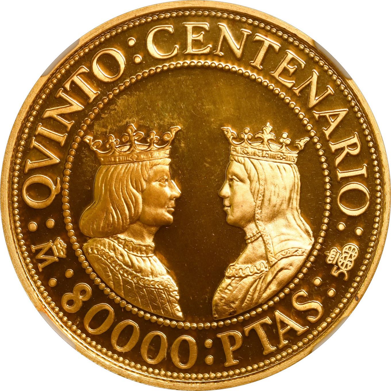 SPAIN, Madrid, gold proof 80000 pesetas, Juan Carlos I, 1989, Ferdinand-Isabel / Discovery of America 500th Anniversary, NGC PF 68 Ultra Cameo. KM-845; Fr-350. Very flashy with nearly perfect surfaces (second highest grade in the NGC census), interesting facing-busts design resembling the "excelente" series of Ferdinand-Isabel on obverse emulated by the current (at the time) King and Queen of Spain on reverse.
