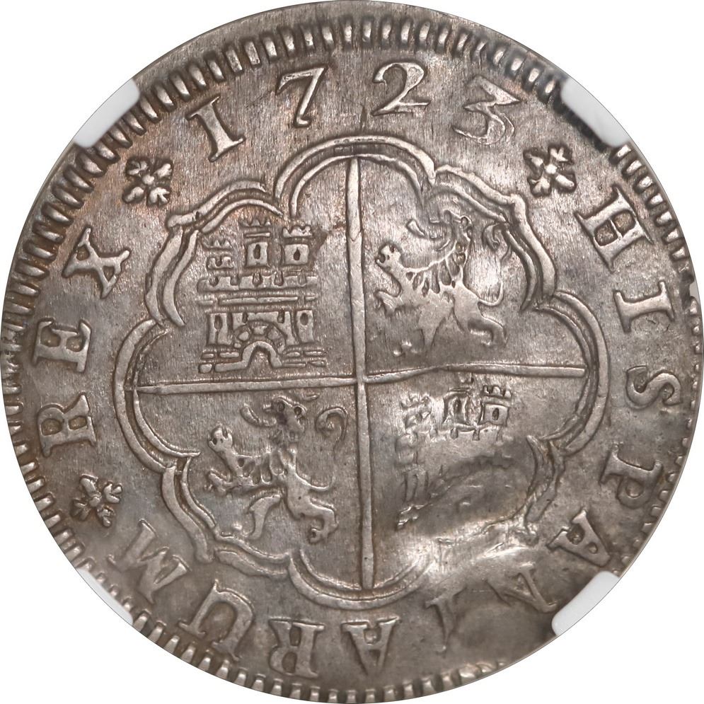SPAIN, Madrid, milled 2 reales, Philip V, 1723 A, NGC MS 62. Cal-777; KM-296. Attractively toned over muted luster, choice full obverse details but some reverse details naturally flat or wrinkled due to curvature from being struck on a roller die, near top grade.