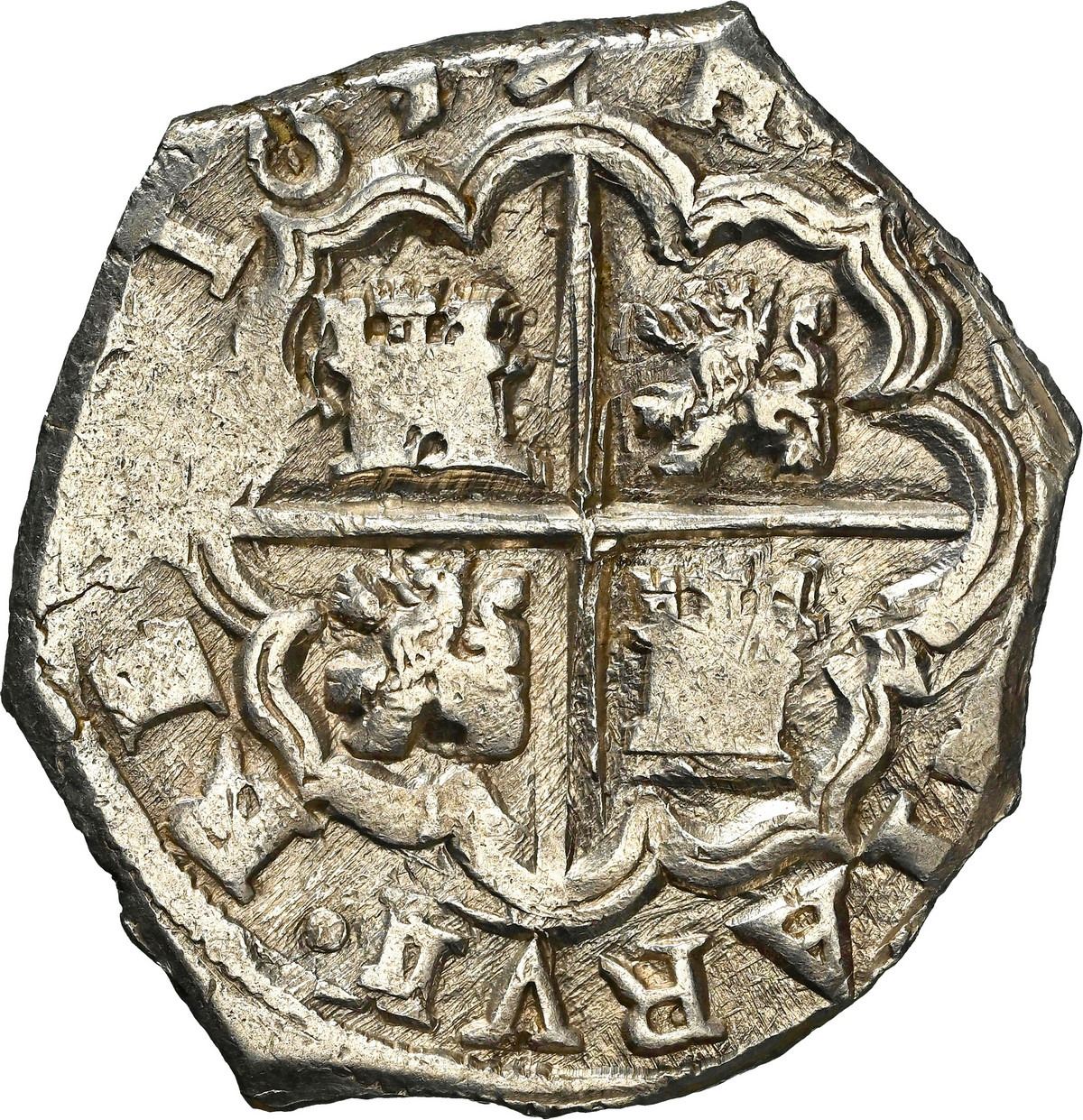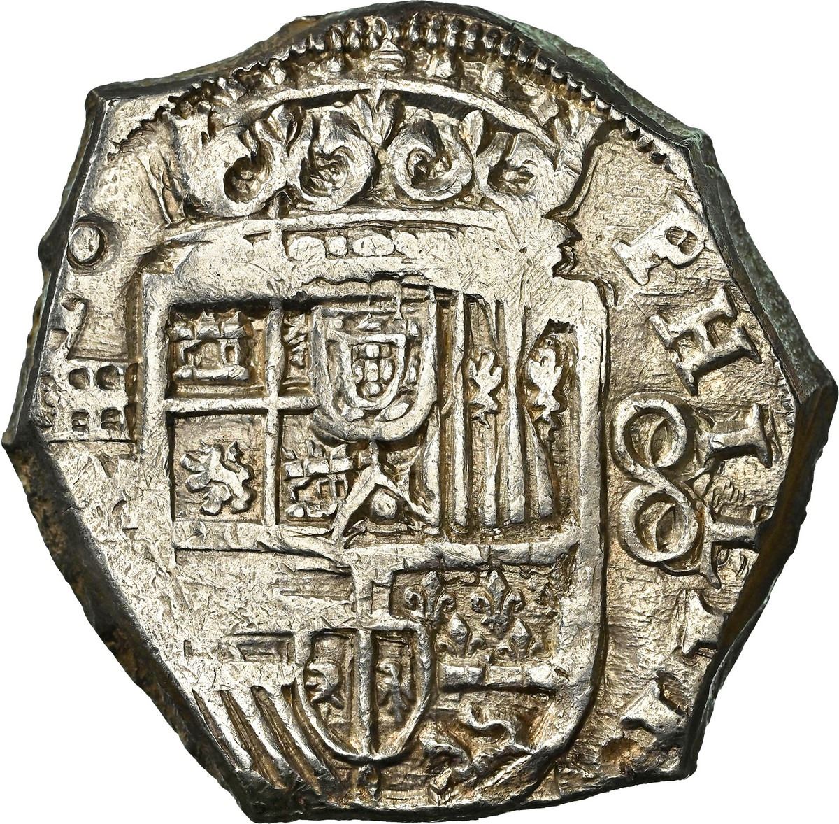 SPAIN, Segovia, cob 8 reales, Philip IV, 1659 M, NGC MS 62, finest known in NGC census, ex-Casandra. Cal-1580. 27.23 grams. Thick and sharply seven-sided flan with superb luster and very bold strike, including choice full crown and shield with large (re-punched) 8 to right inside bold king's name PHILIPVS, aqueduct mintmark to left above weak but certain assayer M, beautifully complete cross-and-tressure with full 16 and bottom half of 59 of date with the 5 punched over a 2 (since this is the first date after a 1620s series), unique in this top grade (next finest being AU 53, although the previous lot might tie with this one if re-done by NGC). NGC #8444886-003. Pedigreed to the Casandra Collection (stated on label).