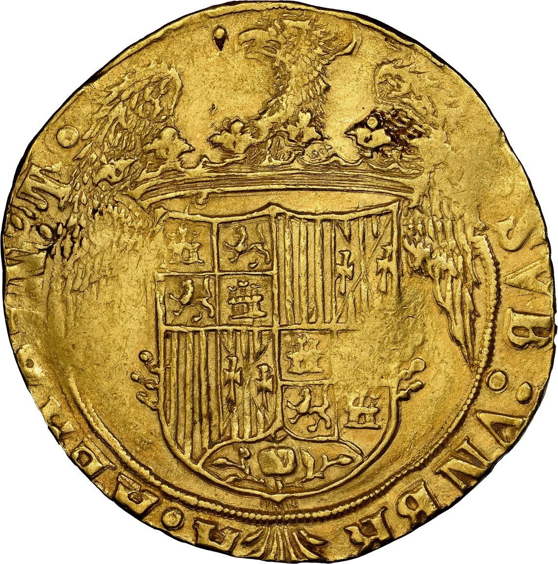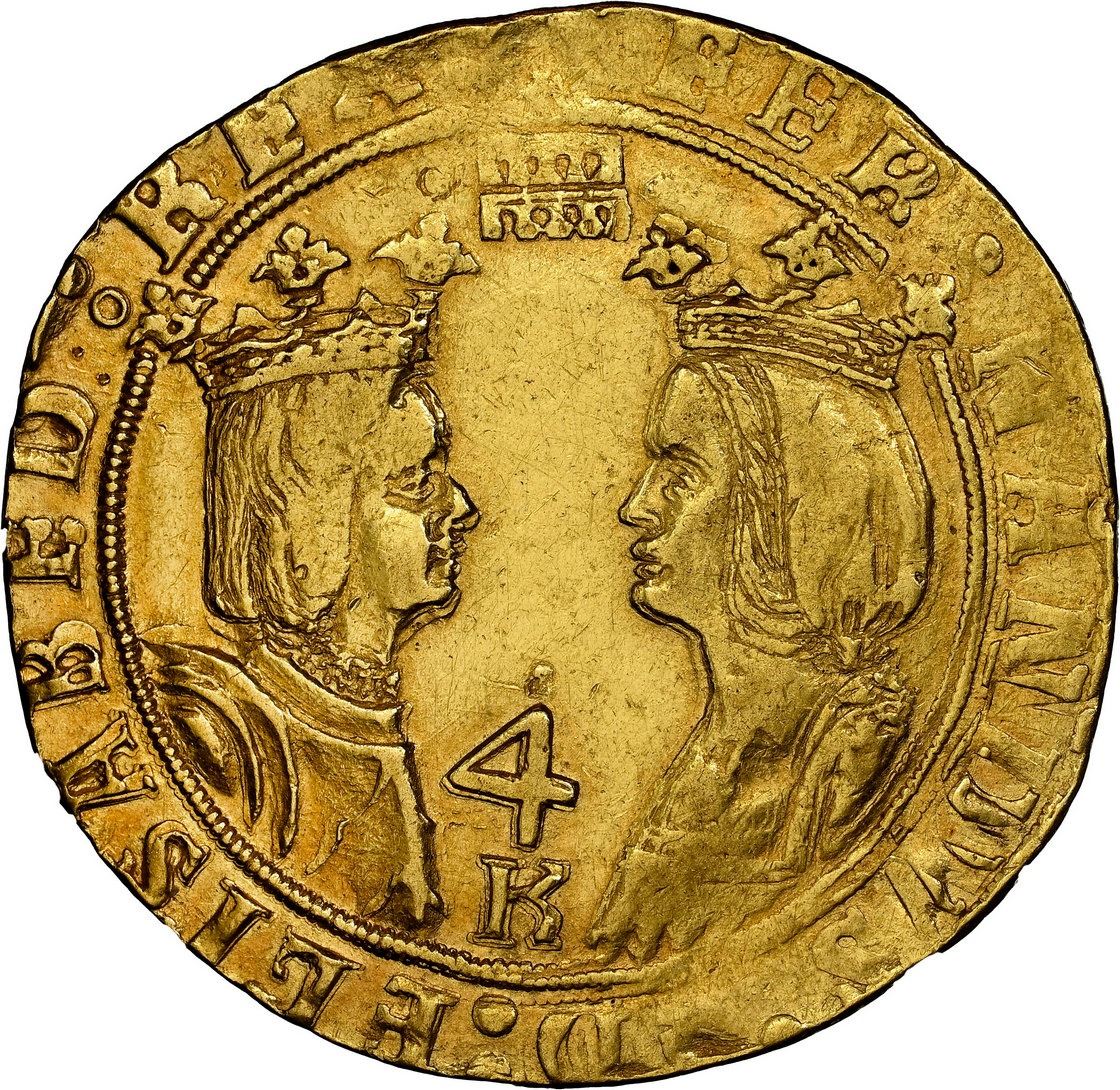 SPAIN, Segovia, gold 4 excelentes, Ferdinand-Isabel, mintmark at top, denomination Arabic 4 above K at bottom between busts, rare, NGC AU 53. Cal-772; Fr-125. 13.93 grams. Impressively broad flan with bold and well-detailed facing portraits, choice full crowned shield, nearly full legends in Latin lettering (later variety), rich gold color with light high-point wear and hairlines on obverse, a rare and desirable type, second finest in NGC census behind a single AU 55 (with one higher at MS62 in the PCGS census).