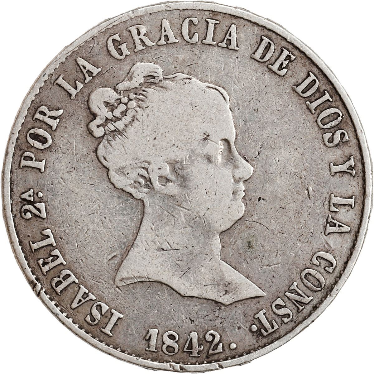 SPAIN, Seville, 10 reales, Isabel II, 1842 RD. Cal-543; KM-585.2. 13.16 grams. Very light gray toning with traces of muted luster, AVF with minor marks, scarce type.