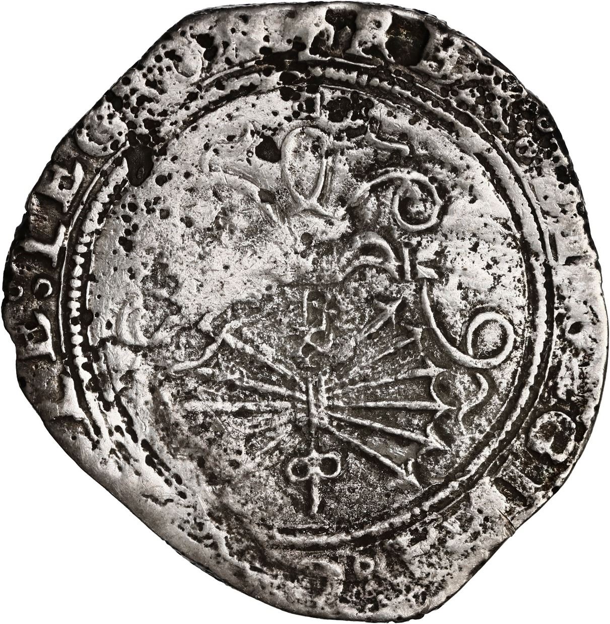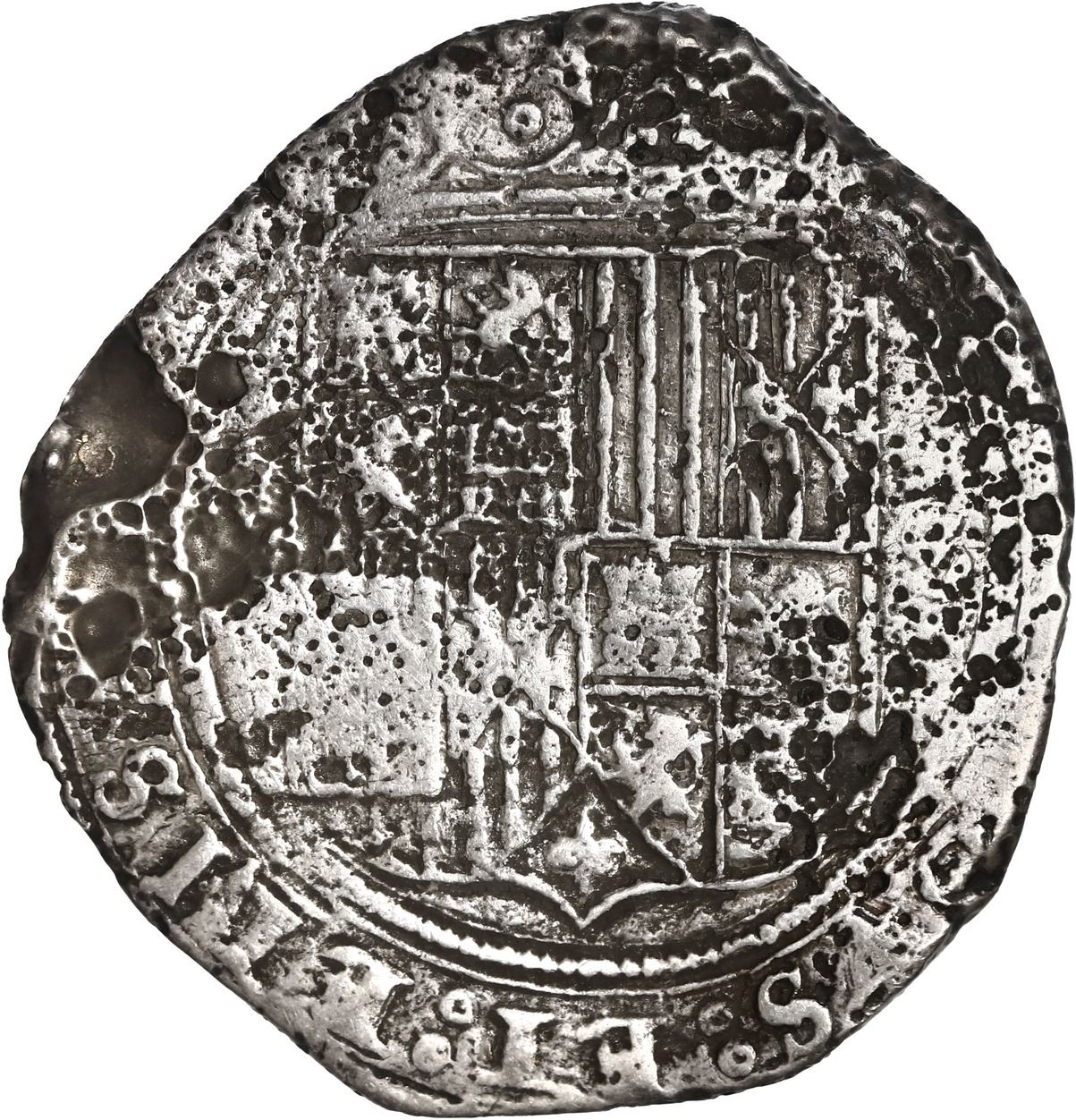 SPAIN, Seville, 4 reales, Ferdinand-Isabel, assayer Gothic D on reverse, mintmark S to right of shield. López de la Fuente-H5.6; Cal-565. 12.12 grams. Rare type from this wreck (or any wreck, for that matter), with some surface corrosion but reasonably clear central details and legends, this particular variety of reverse with assayer at top above yoke not listed in López de la Fuente. Pedigreed to the Ponterio auction of September 2007, with original lot-tag 1086, and to Sedwick Auction 11, with original lot-tag 229. Recovered from: Santiago, sunk in 1585 off Bassas da India in the Indian Ocean