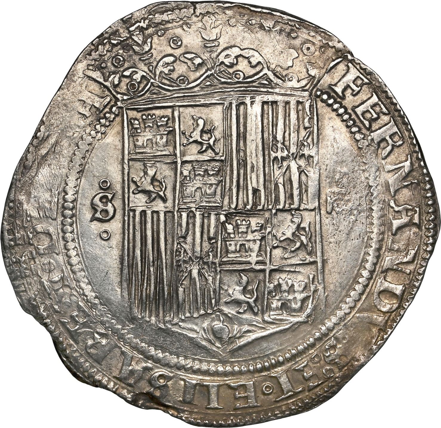 SPAIN, Seville, 4 reales, Ferdinand-Isabel, assayer * on reverse, mintmark oSo to left on obverse, NGC MS 62. López de la Fuente-H5.5; Cal-561. 13.62 grams. Extremely broad flan with full crown and Latin legends, choice full interiors with oSo mintmark to left and denomination o-iiii to right of well-detailed full shield and assayer * to right of arrows on reverse, legends ending in GRA on obverse and GR on reverse (this exact variety not listed in López de la Fuente), lightly toned and lustrous all over, with minor edge-split, graded within the top 30% in the NGC census.