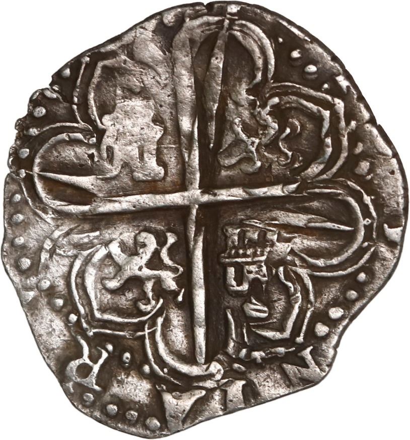 SPAIN, Seville, cob 1 real, 1590/89 date to right assayer Gothic D below mintmark S and denomination I to left. Cal-266. 3.37 grams. Broad, oblong flan with very full and bold date to right of choice full shield with doubling at top left above full S-I-Gothic D, excellent full cross-lions-castles (also slightly doubled), XF with traces of oxidation, contrastingly toned.