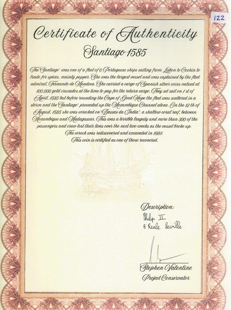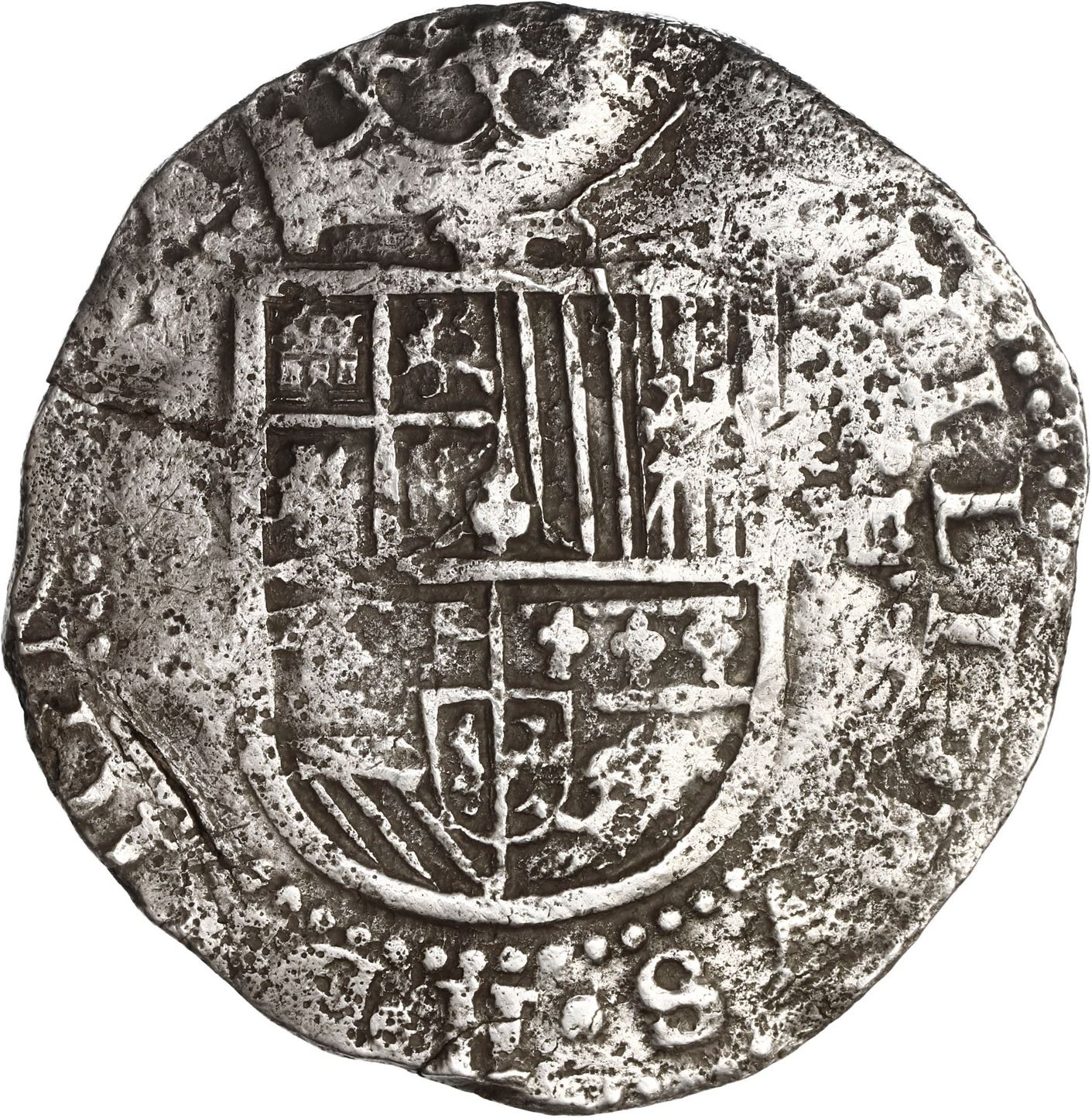 SPAIN, Seville, cob 8 reales, Philip II, assayer Gothic D at 4 o'clock outside tressure on reverse. Cal-720. 26.51 grams. Unevenly thick flan with bold full cross and shield, much legend, lightly toned, minimal surface corrosion. Pedigreed to the Steve Valentine Collection, with original certificate from the salvor/conservator. Recovered from: Santiago, sunk in 1585 off Bassas da India in the Indian Ocean