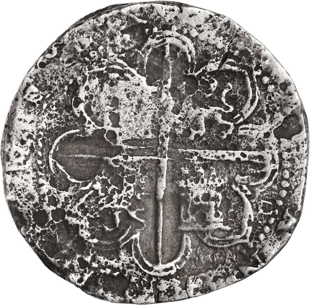 SPAIN, Seville, cob 8 reales, Philip II, assayer Gothic D at 4 o'clock outside tressure on reverse. Cal-720. 23.55 grams. Nice round flan with well-centered full cross and shield plus full crown and much legend, nicely toned but with fine pitting all over and minor edge-split. With certificate. Recovered from: Santiago, sunk in 1585 off Bassas da India in the Indian Ocean