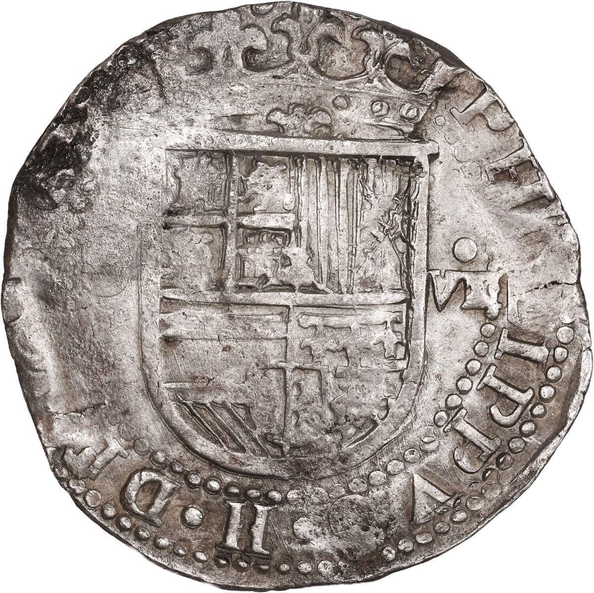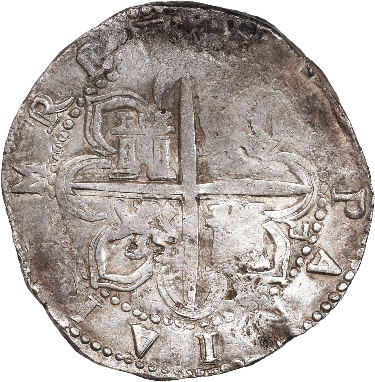 SPAIN, Seville, cob 8 reales, Philip II, assayer Gothic D at 4 o'clock outside tressure on reverse,