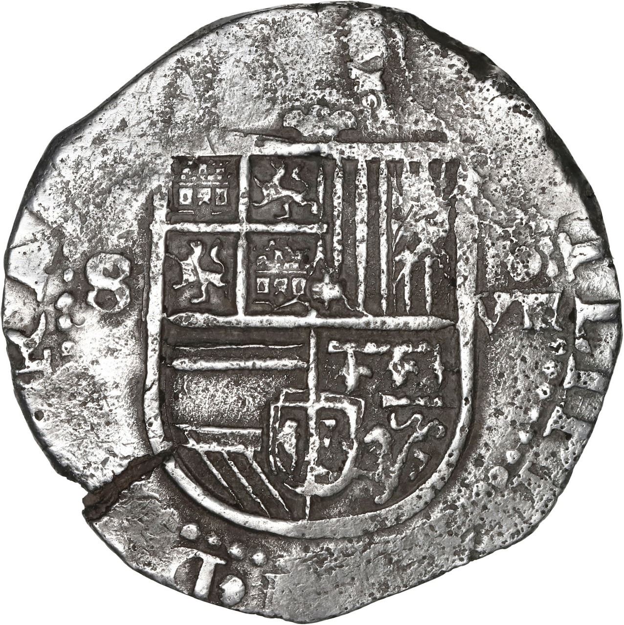 SPAIN, Seville, cob 8 reales, Philip II, assayer not visible (Gothic D on reverse). Cal-720. 26.42 grams. Solid and thick coin with nice obverse featuring a bold shield and almost no corrosion, full cross with some mild pitting, natural crack along the edge, XF details overall. Pedigreed to the Steve Valentine Collection, with original certificate from the salvor/conservator. Recovered from: Santiago, sunk in 1585 off Bassas da India in the Indian Ocean
